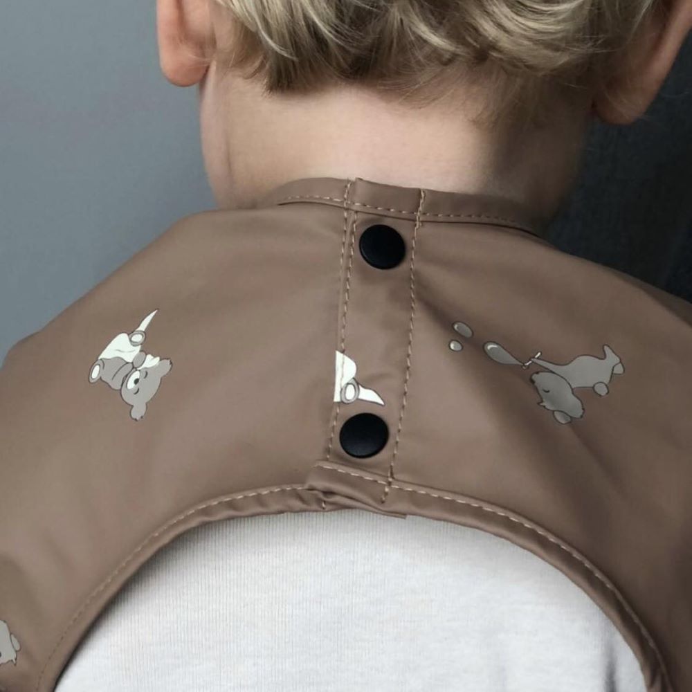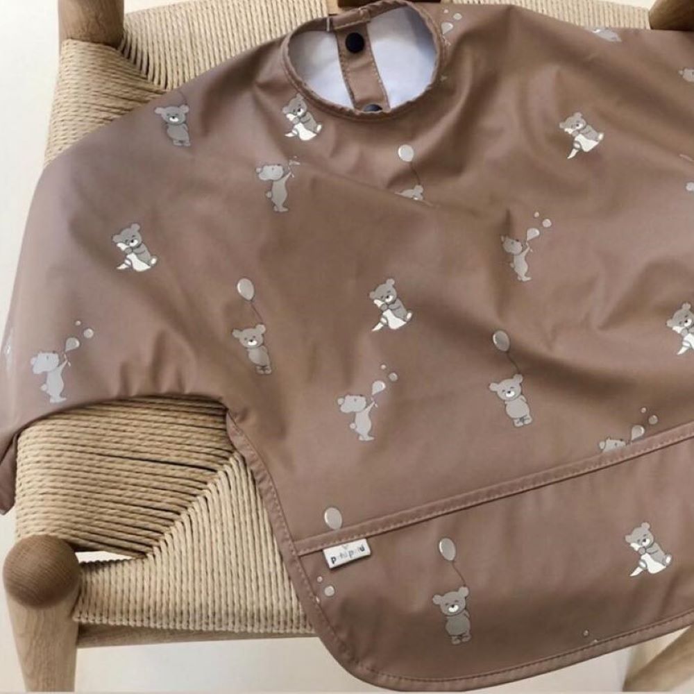 Babete impermeável com mangas, punhos elásticos e bolsa à frente.