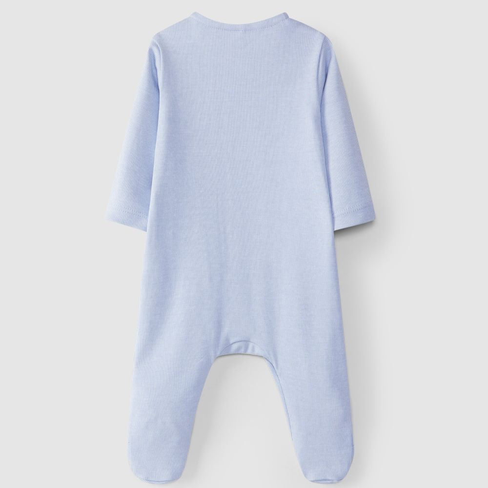 Babygrow sem gola em malha de risca fina 100% algodão. Detalhe de bolso funcional na frente. Aperta com molas à cor na frente e no entrepernas.