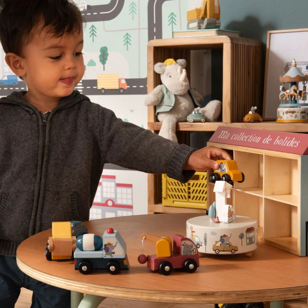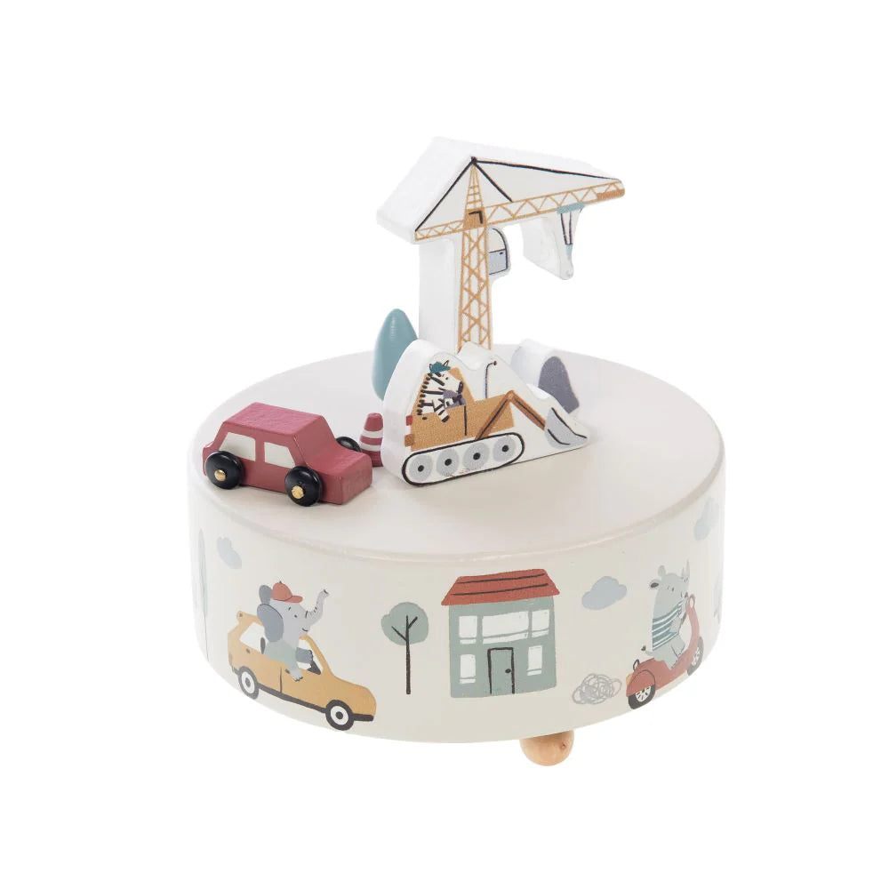 Esta encantadora caixa de música é perfeita para estimular a imaginação das crianças. Com um tema de construção, apresenta figuras detalhadas, como uma grua, um trator e veículos coloridos, tudo em madeira pintada. A base é decorada com ilustrações alegres de cenários urbanos, incluindo casas, árvores e animais em carros.
