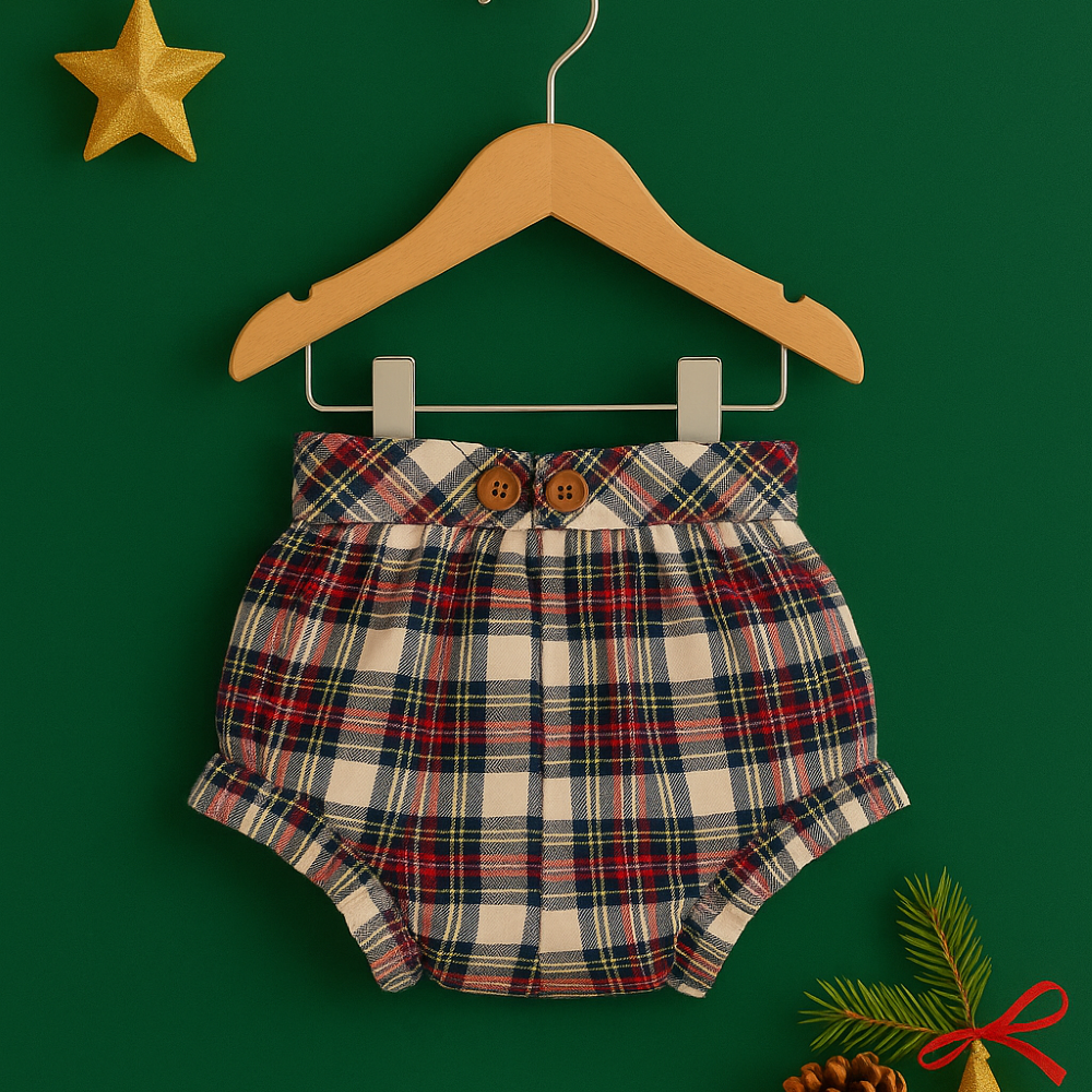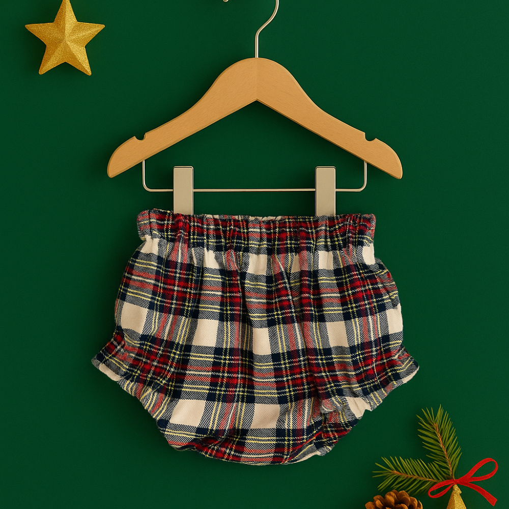 Calção/ Tapa fraldas para menina ou menino, com padrão axadrezado. Tem elástico à volta da cintura.