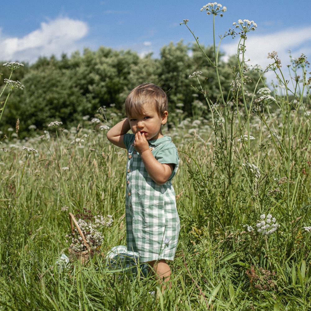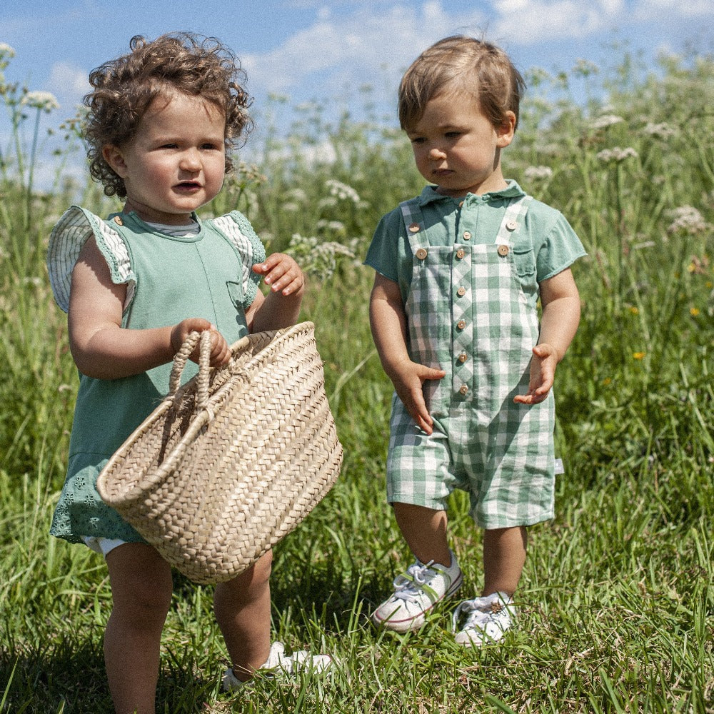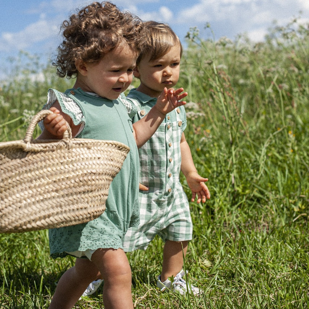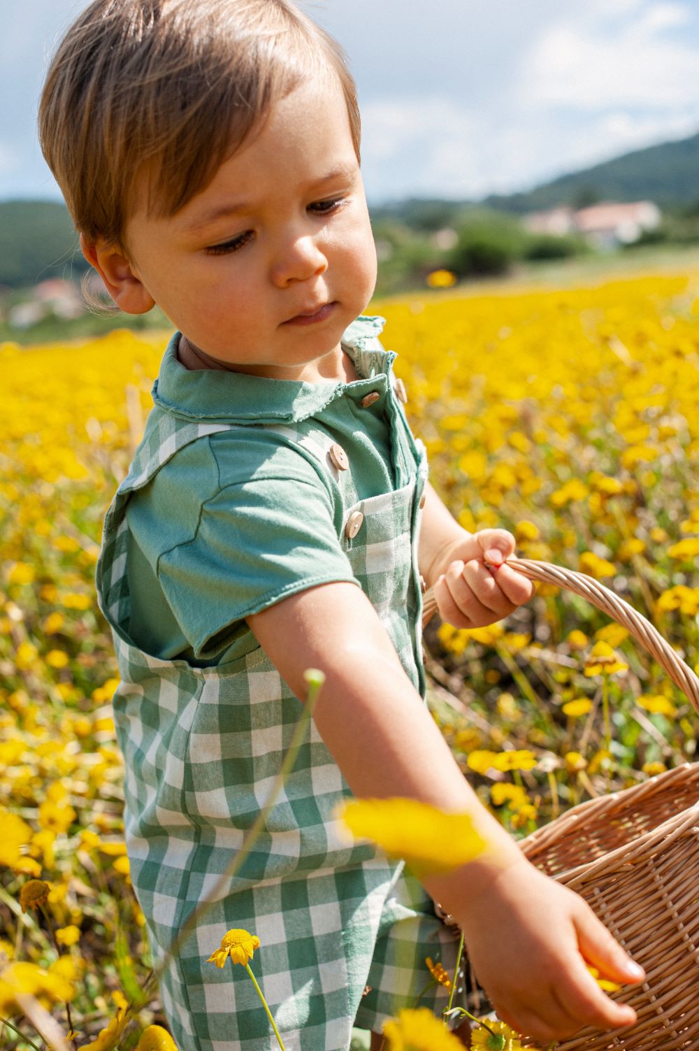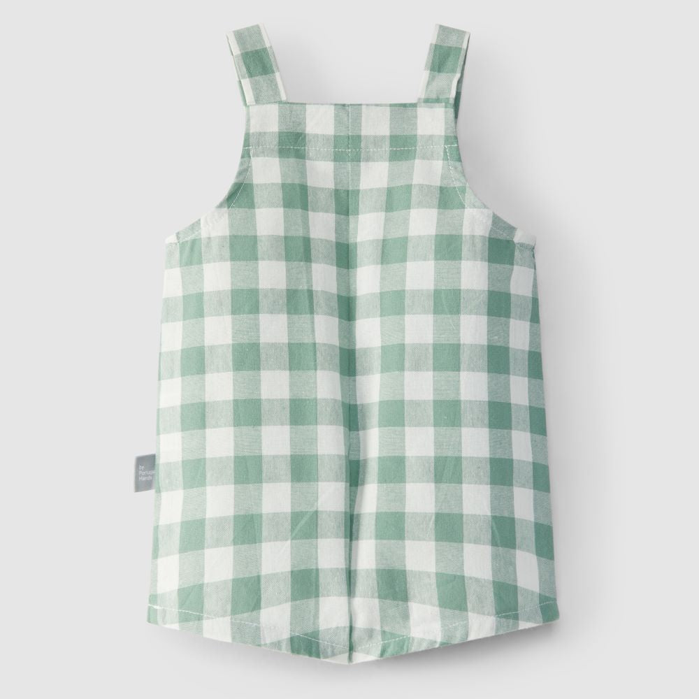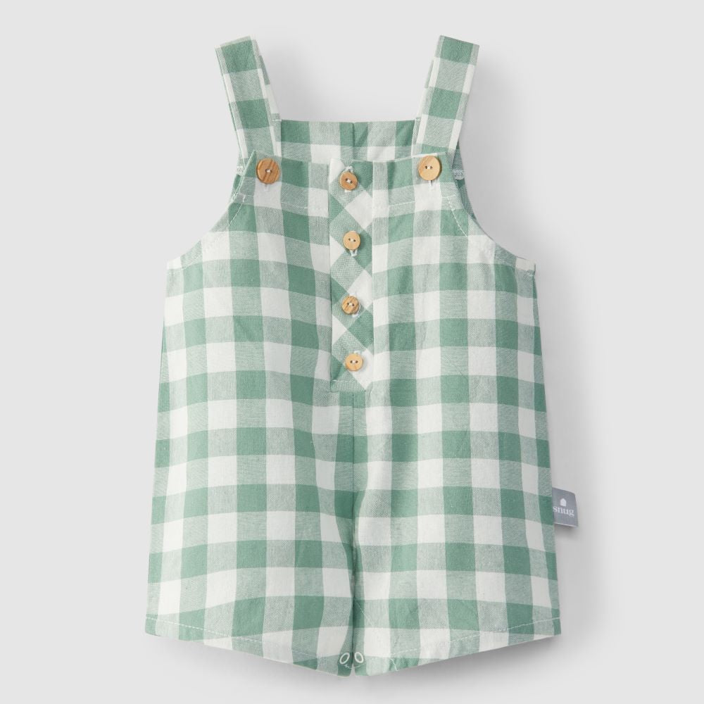 Chest shorts in 100% cotton fabric with a square print. Fastens on the straps and front with wooden buttons.