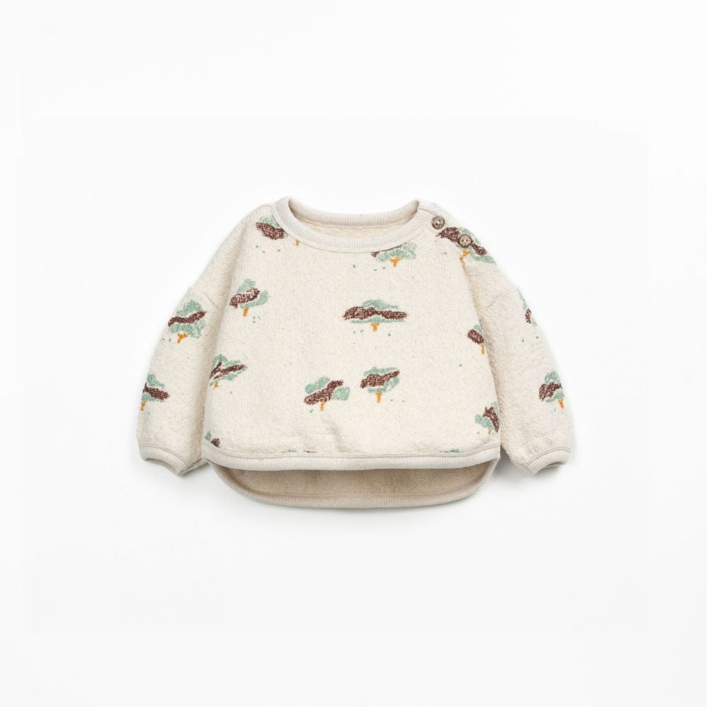 Esta camisola é feita em malha com mistura de algodão orgânico e algodão regenerativo, na cor Meio Branco. É um modelo com manga comprida, decote redondo, abertura no ombro com botões de coco e o nosso estampado de árvores.