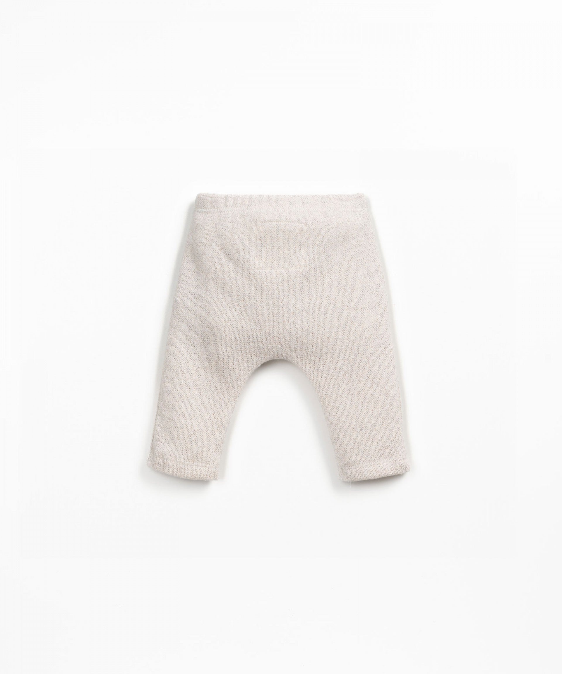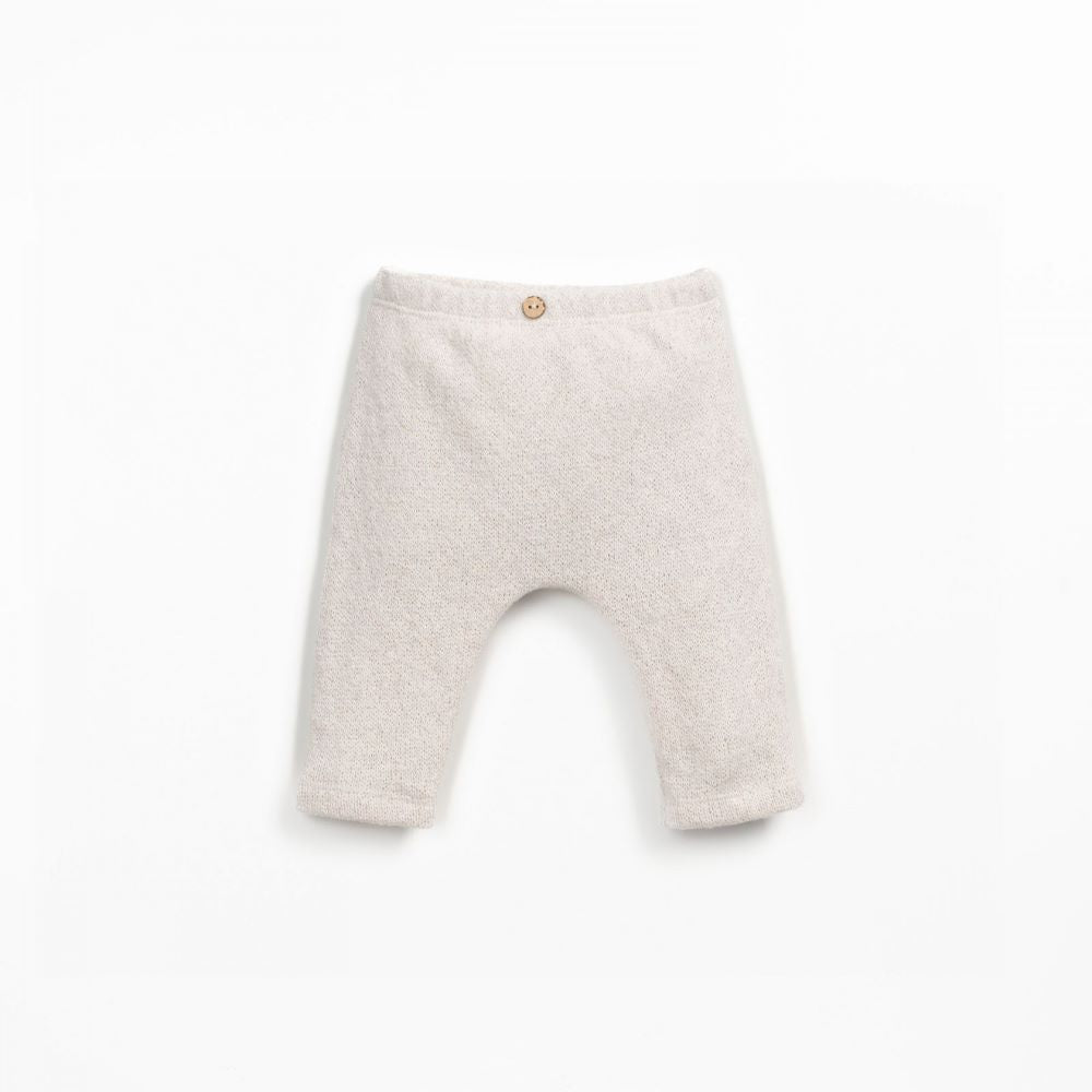 Estas leggings são feitas em malha com mistura de algodão regenerativo e algodão reciclado, na cor Meio Branco. São um modelo com carda interior, cintura elástica e botão de coco decorativo.