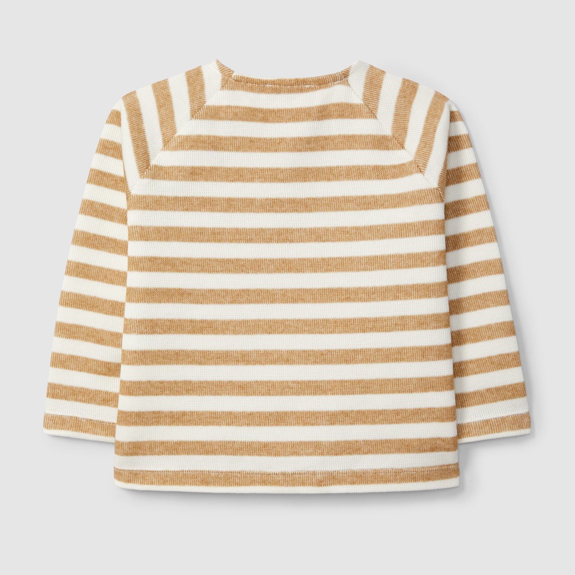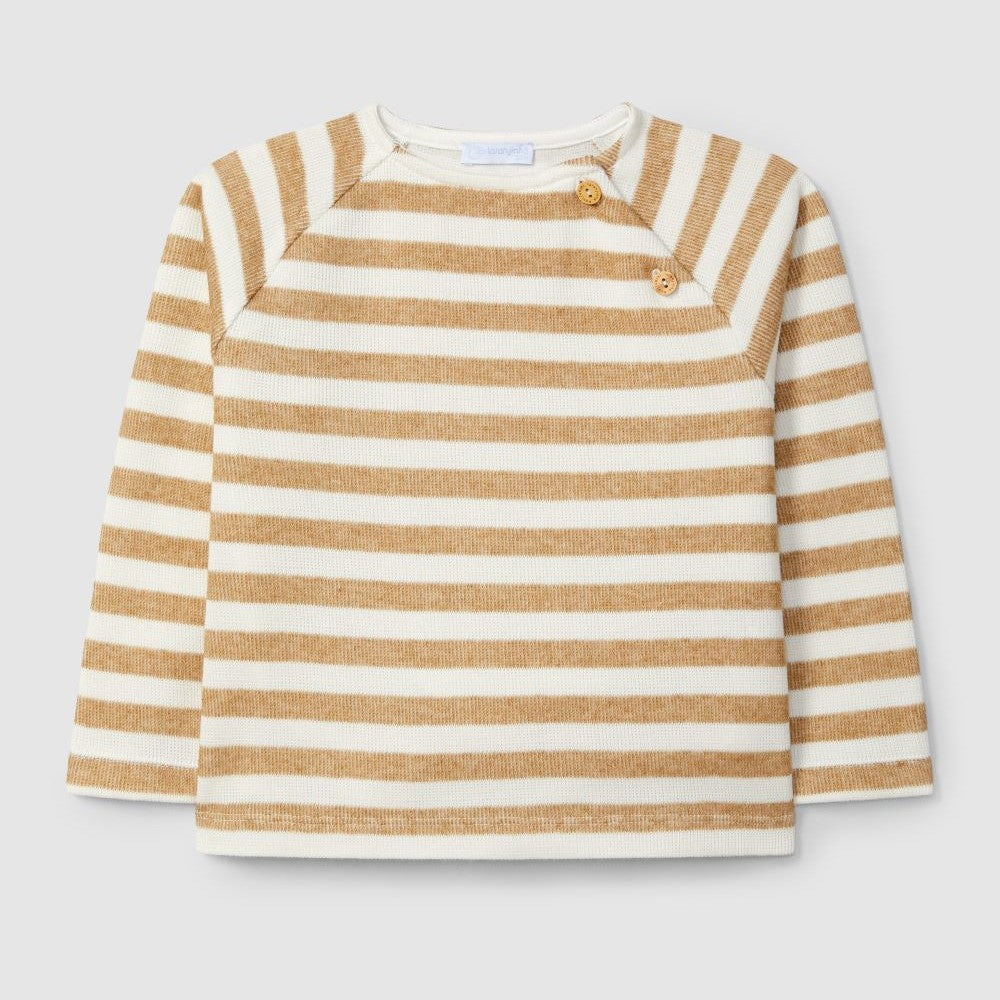 Longsleeve em malha de riscas com aspecto tricotado 100% algodão. Aperta com botões de madeira Laranjinha na frente.