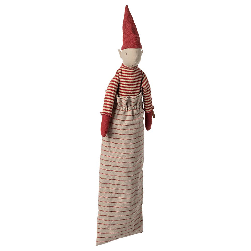 Um duende de pernas compridas em um terno de malha macia, tem ímãs nas mãos para que possa sentar ou pendurar onde for adequado. Ele vem em saco de tecido macio.