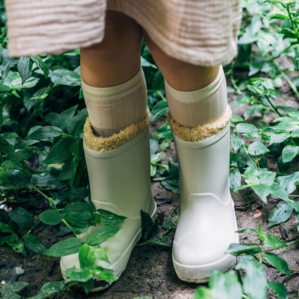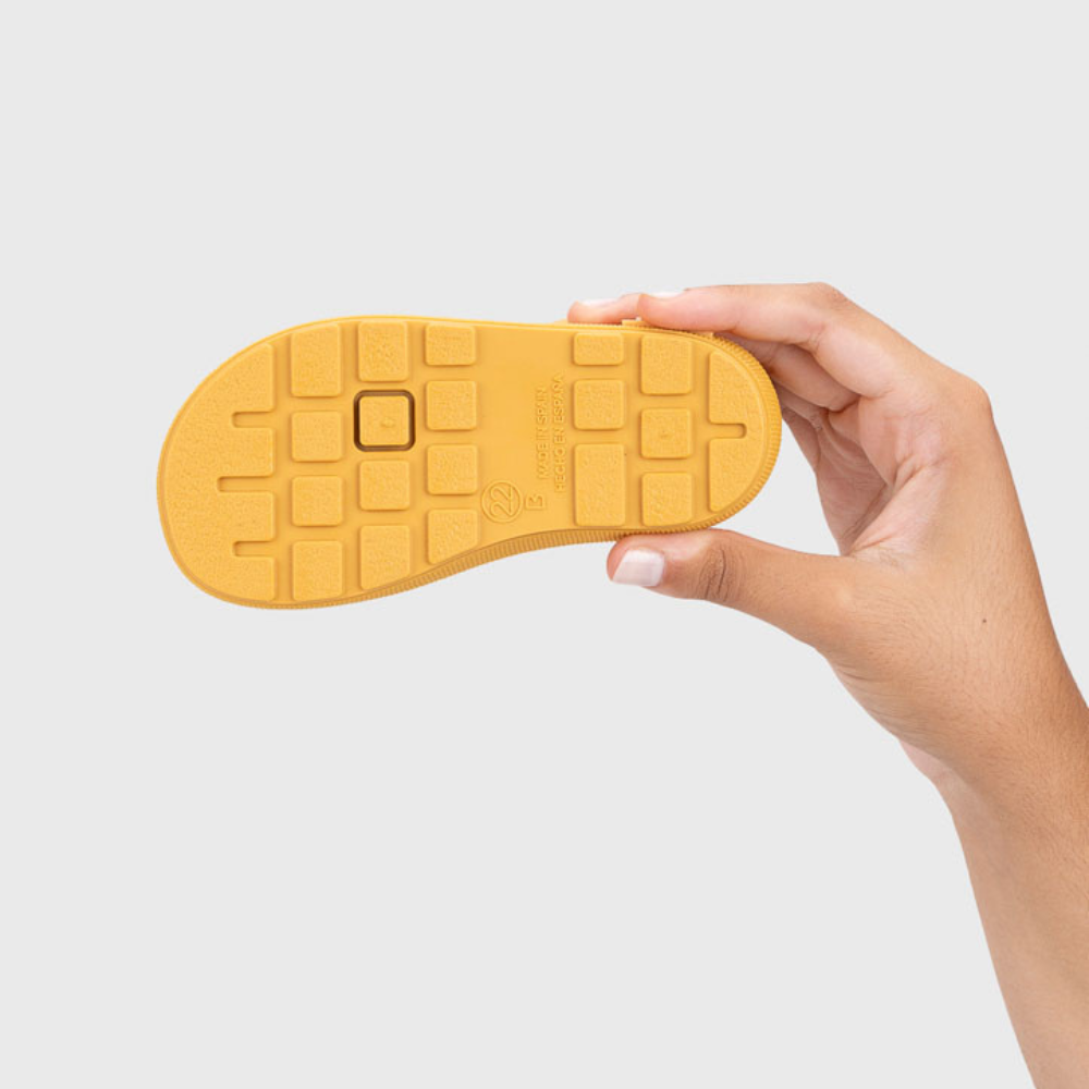 Estas galochas tem sola fina, dura e flexível fazendo com que a criança sinta como se andasse descalço e por não ter contraforte nem qualquer desnível, permitem que as crianças brinquem à chuva mantendo o conforto, respeito pelo natural desenvolvimento do pé e oferecendo espaço para que os dedos se movimentem dentro das galochas.