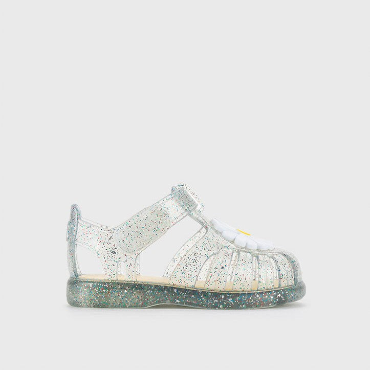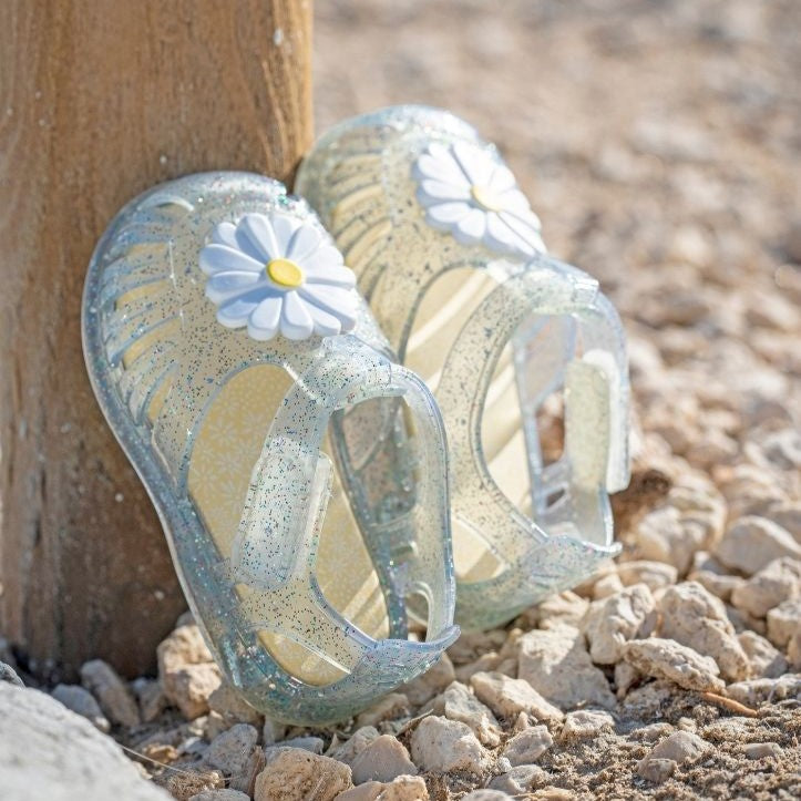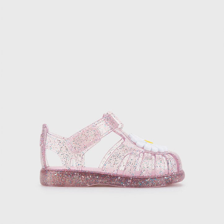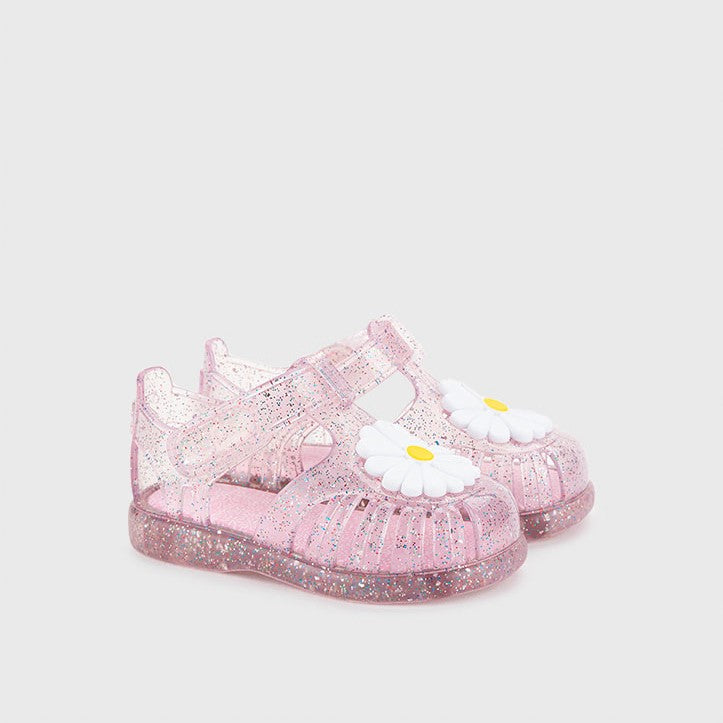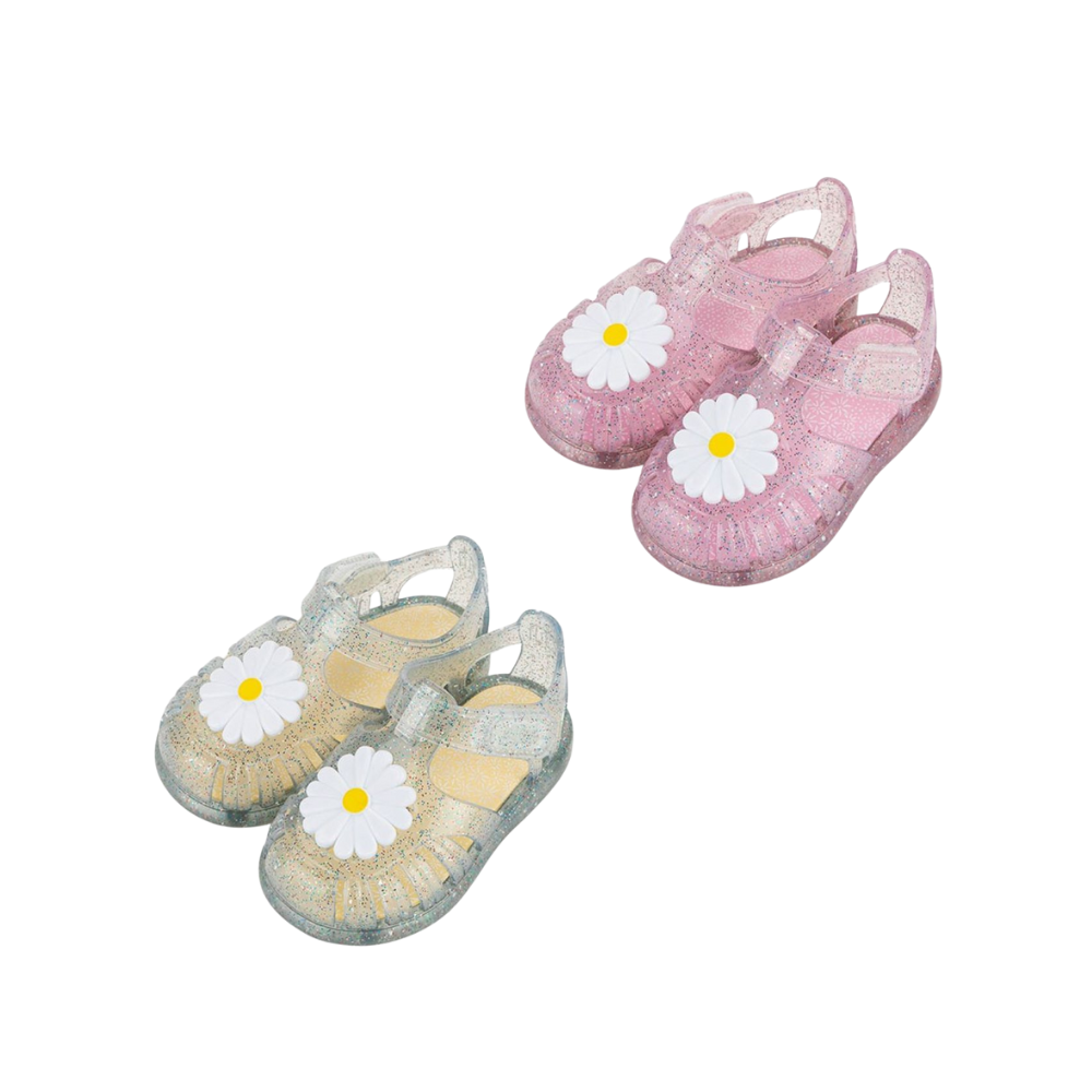 Sandales avec finition pailletée, transparentes ou roses, fermeture par velcro adhésif, avec motif fleuri.