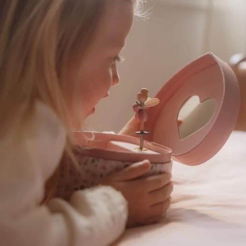 Esta caixa colorida, com a mais doce fada e as flores mais bonitas, oferece muito espaço para guardar joias ou outros tesouros. Ao dar corda, a música toca quando a caixa é aberta, e uma fada começa a dançar em frente ao espelho. Este é o presente perfeito que a tua pequena irá guardar com carinho para toda a vida!