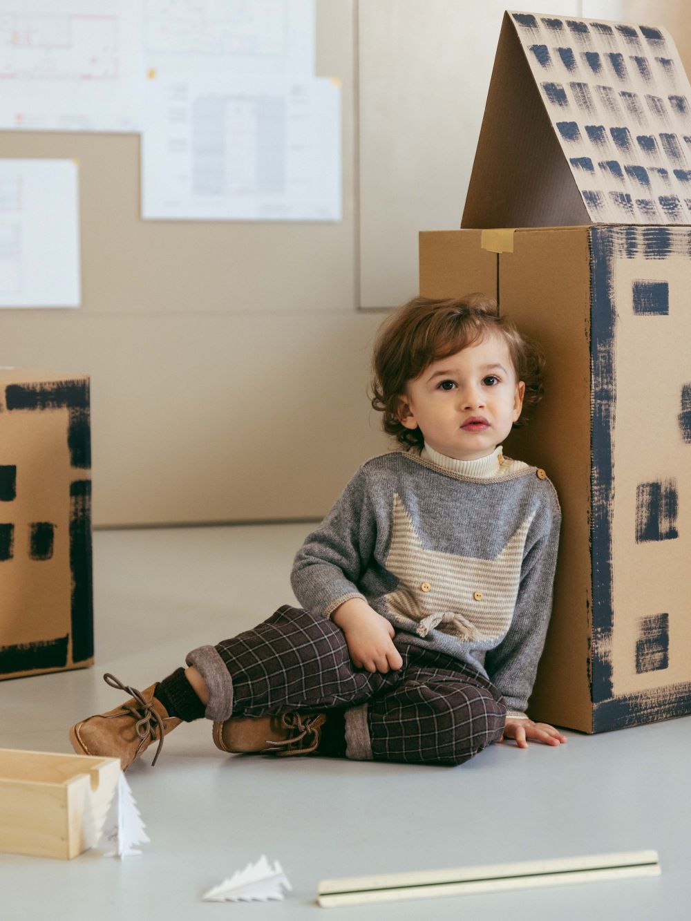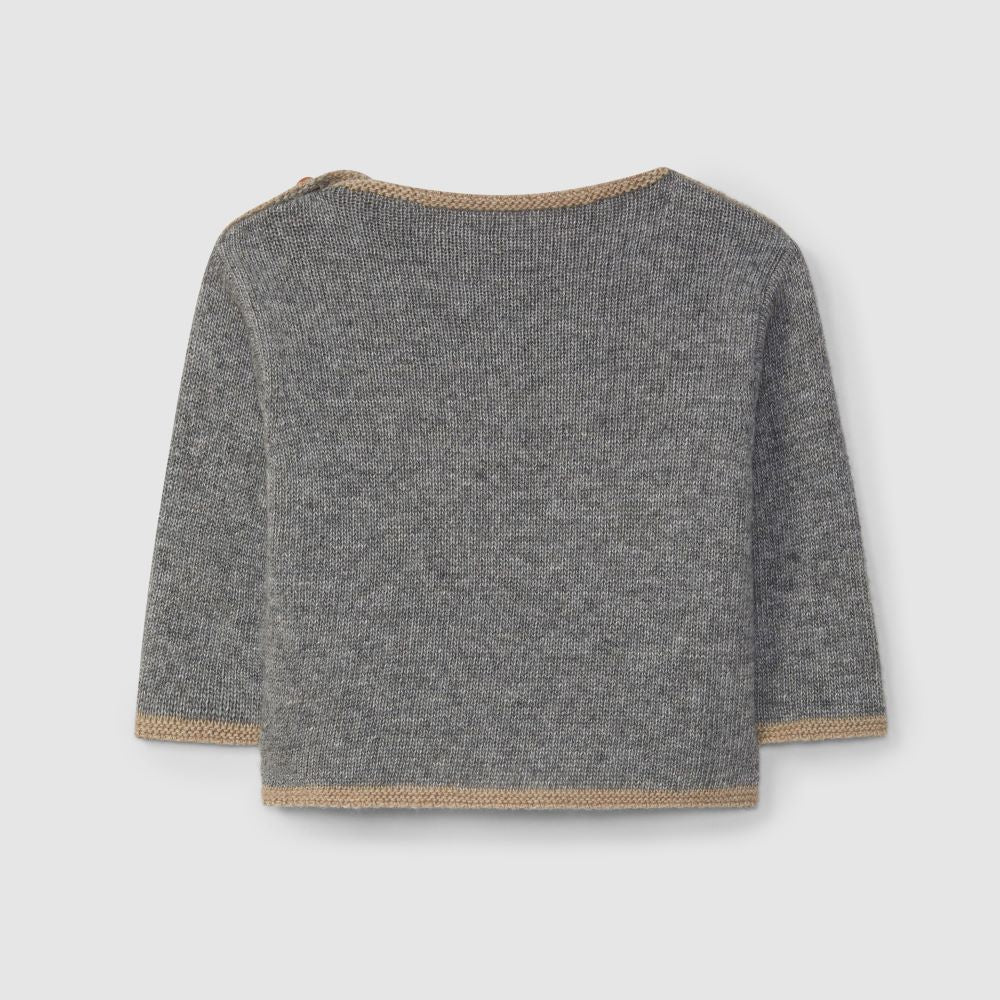Camisola tricotada com gola em barco em lã merino, poliamida reciclada e um toque de caxemira. Jacquard de gato com detalhes em relevo. Aperta com botão de madeira no ombro até aos 18 meses.