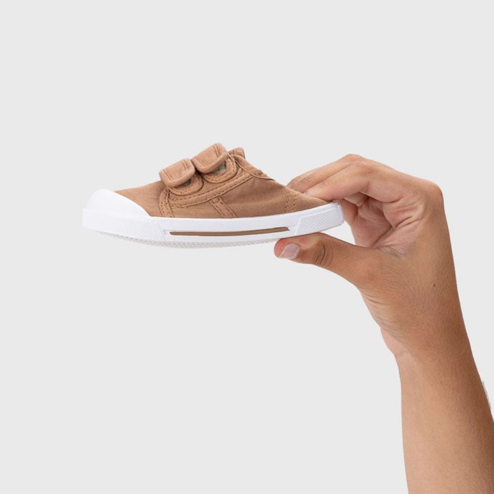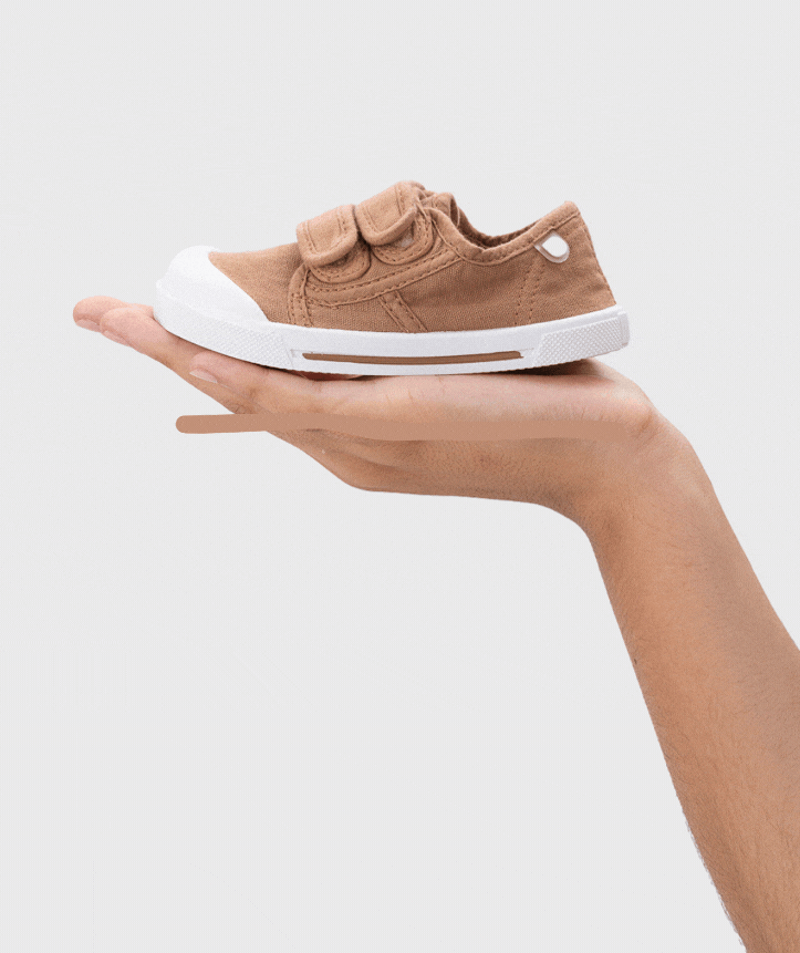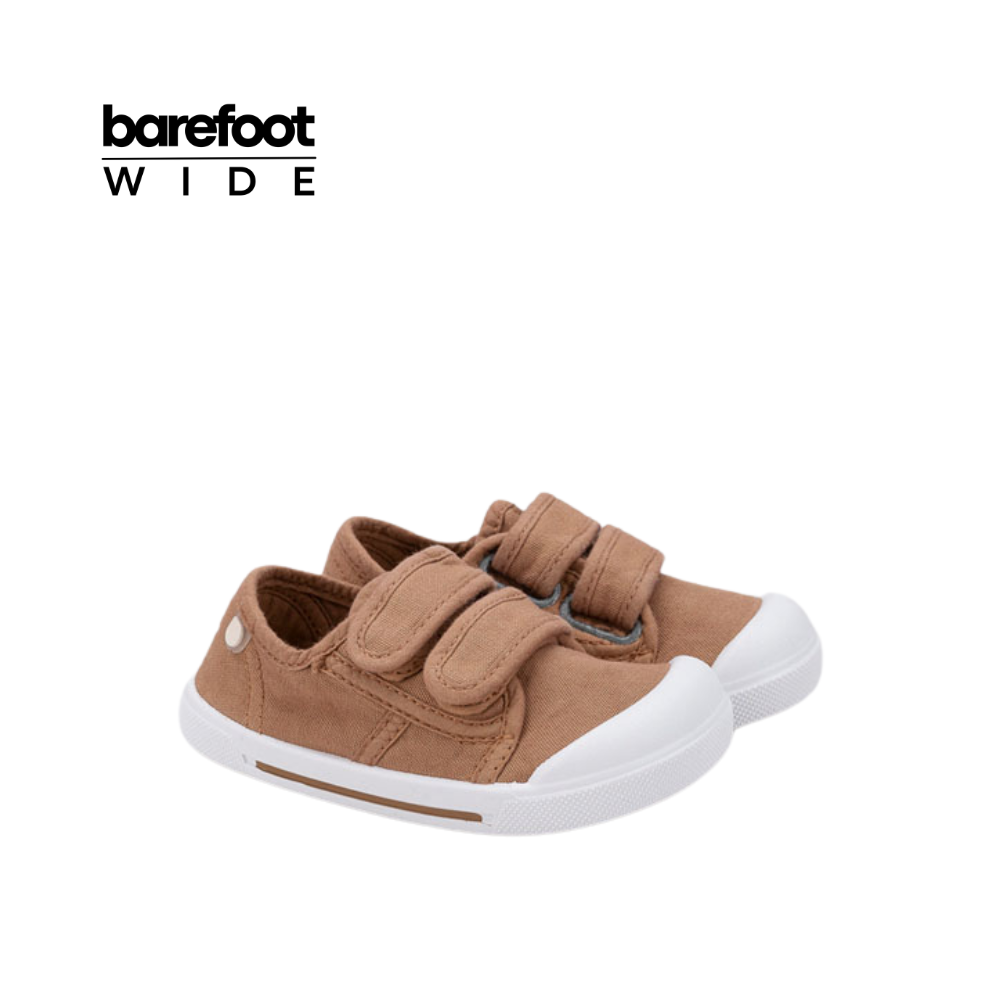 Confeccionada em 100% algodão, apresenta duas tiras de fixação em velcro que garantem um ajuste prático e confortável. Desenhada segundo o conceito barefoot wide, oferece uma ponteira extra larga, sola fina, queda zero e flexibilidade total — promovendo o desenvolvimento natural do pé.