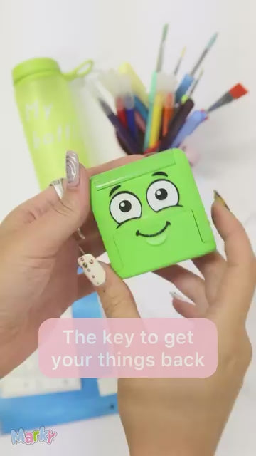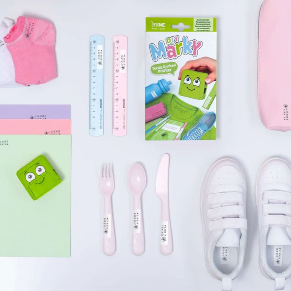 MARKY, o carimbo de marcação inteligente para escola, desporto e lazer, elimina agora a incómoda perda e mistura de objetos. O atraente conjunto, embalado numa apelativa caixa de cartão, contém não só o carimbo com um rosto simpático, mas também um conjunto abrangente de tipos com todas as letras do alfabeto e elegantes pictogramas. O conjunto também inclui pinça, fita adesiva para tecidos escuros e etiquetas próprias para máquina de lavar louça.