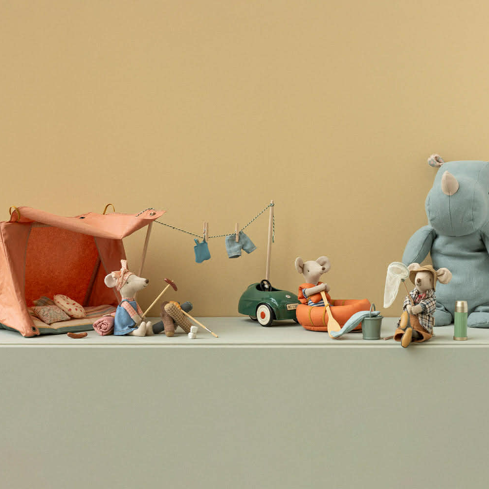 O meio de transporte perfeito para as aventuras dos ratinhos Maileg. Este carro metálico foi pensado para encaixar nos tamanhos Little Brother/Sister, Big Brother/Sister e Mum/Dad, permitindo criar histórias cheias de movimento e imaginação.