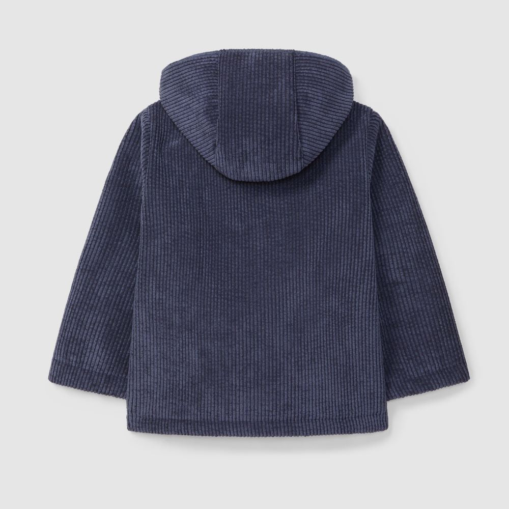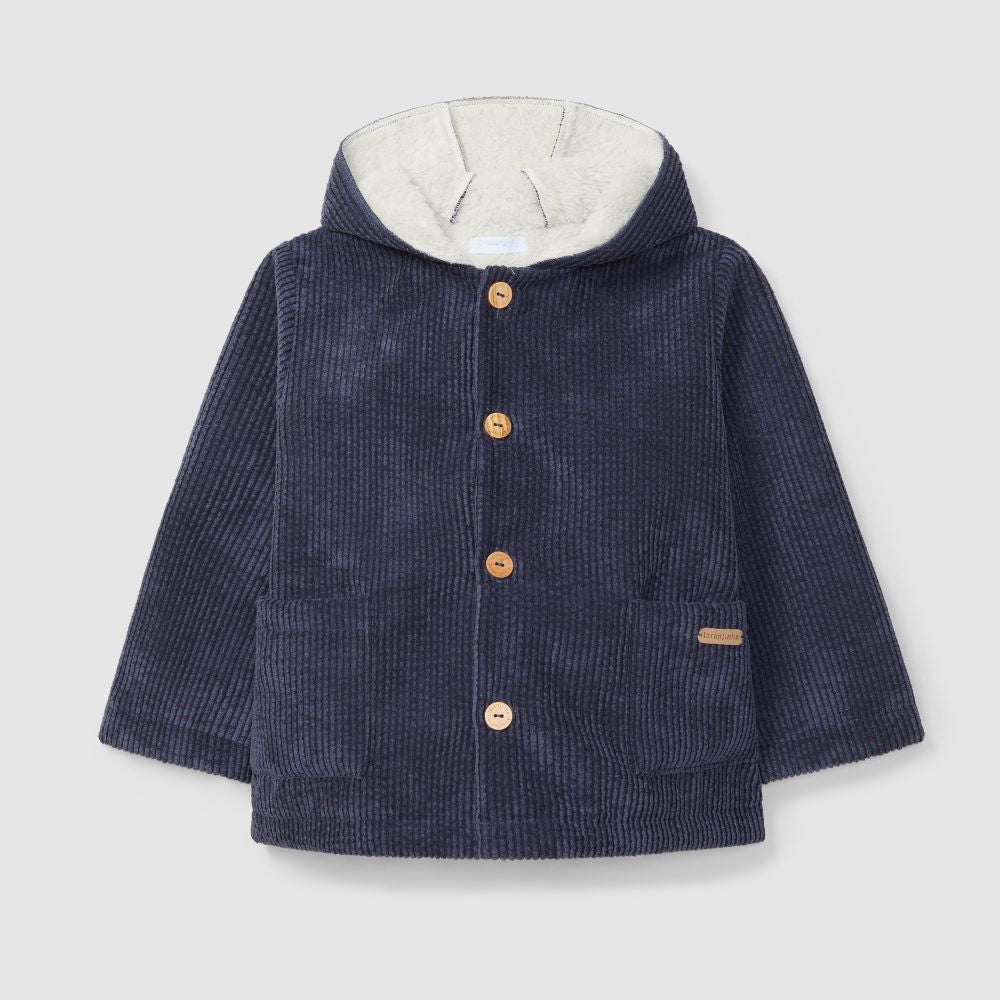 Casaco de capuz em tecido duplo bombazine e pelo no interior. Bolsos funcionais na frente. Aperta com botões de madeira Laranjinha na frente.