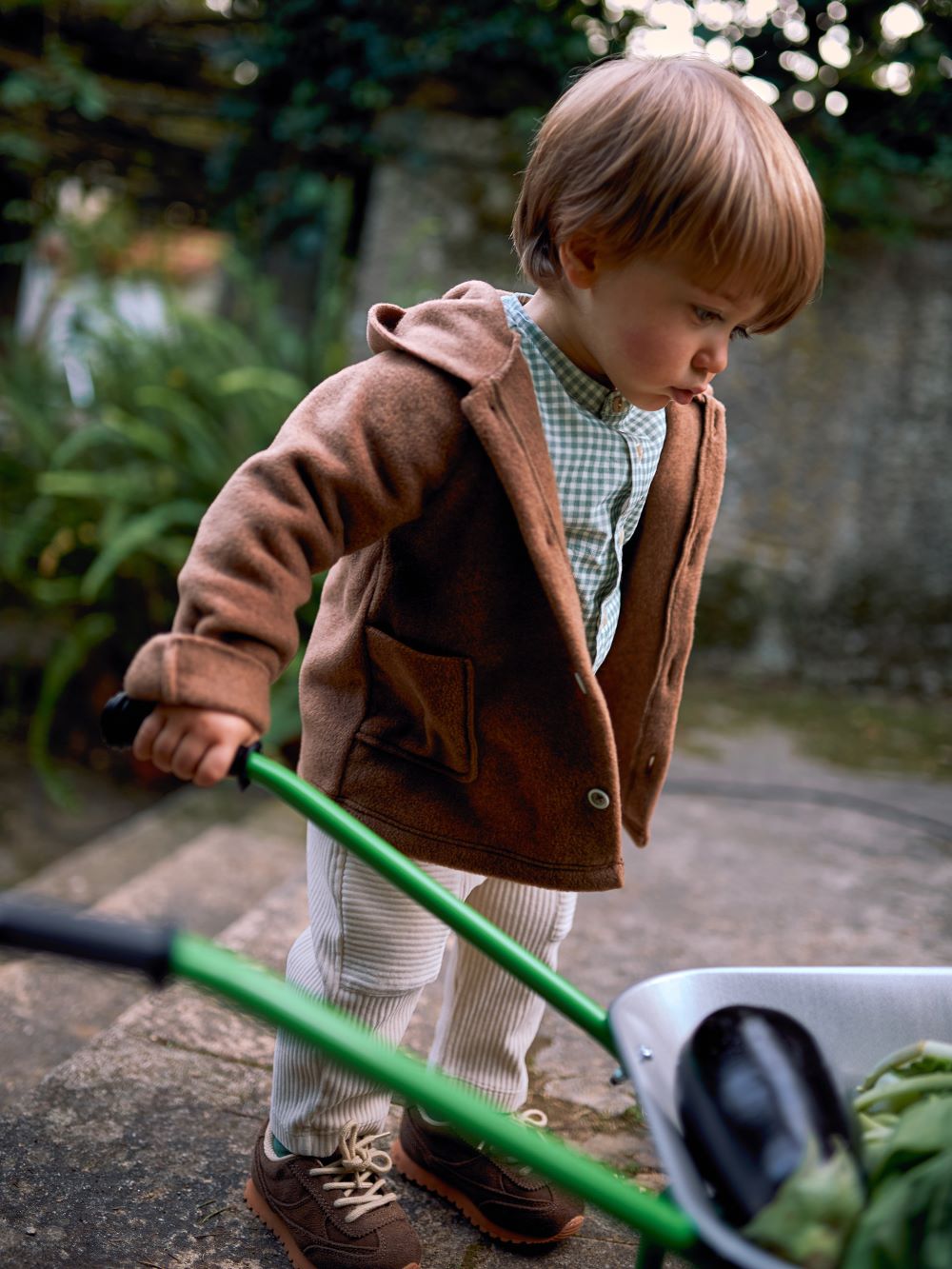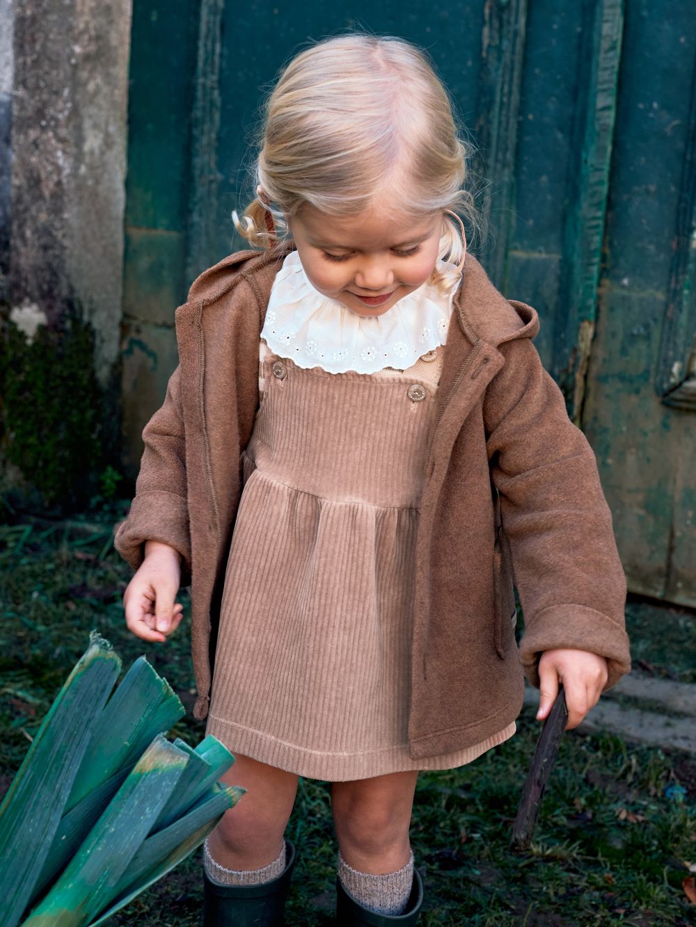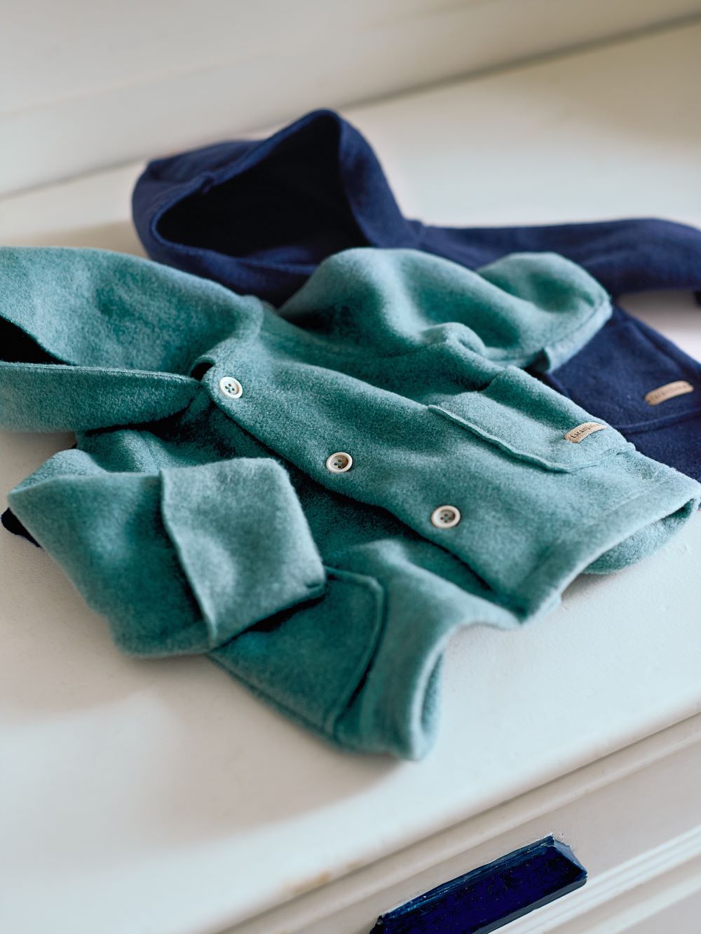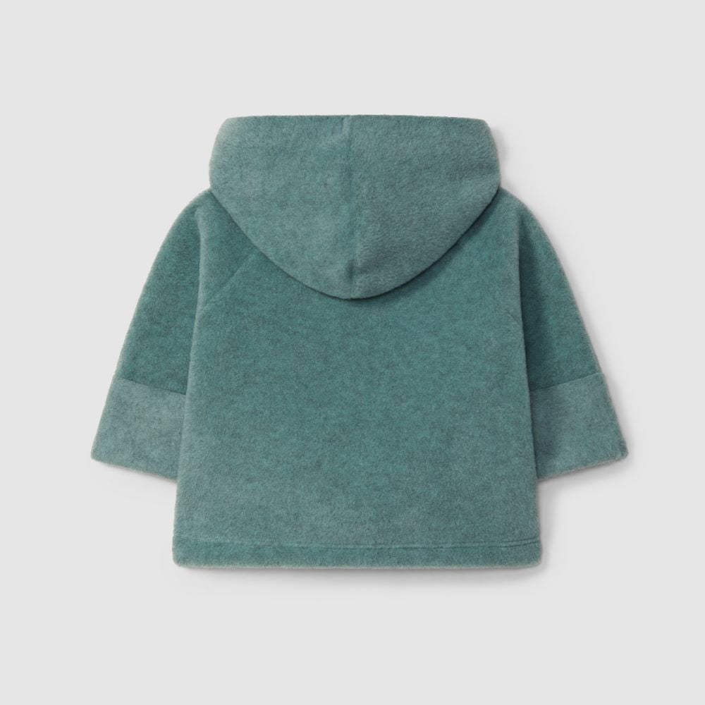 Casaco polar com capuz e bolsos funcionais na frente. Mangas podem ser utilizadas como luva nos tamanhos até aos 24 meses. Aperta com botões na frente a todo o comprimento.