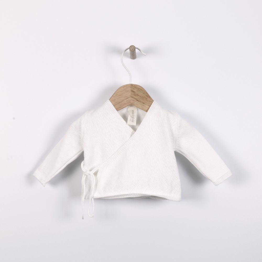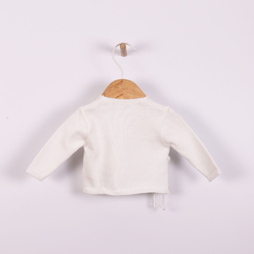 Casaco de manga comprida tricotado em malha fina de algodão orgânico, suave e respirável, ideal para bebés recém nascidos, meninos e meninas. O casaco BABY LOVE aperta na frente em trespasse com um botão madrepérola no interior e um laço no exterior.