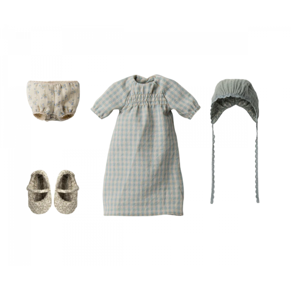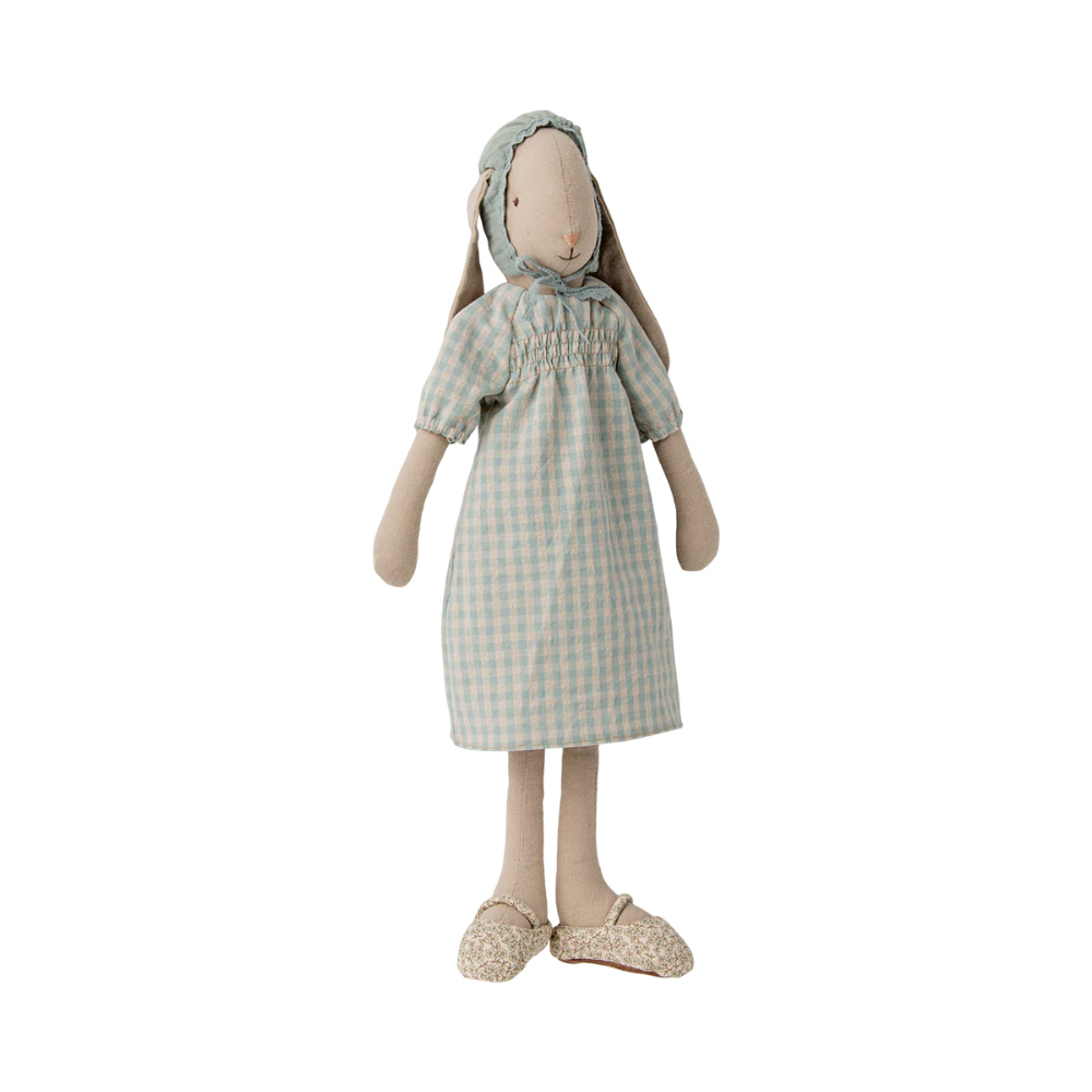 Esta coelha em tamanho 3 está com um lindo vestido, um adorável chapéu, roupa interior e pequenos sapatos – repara em todos os detalhes encantadores. As diferentes peças de roupa criam um visual completo, tornando-o ainda mais adorável.