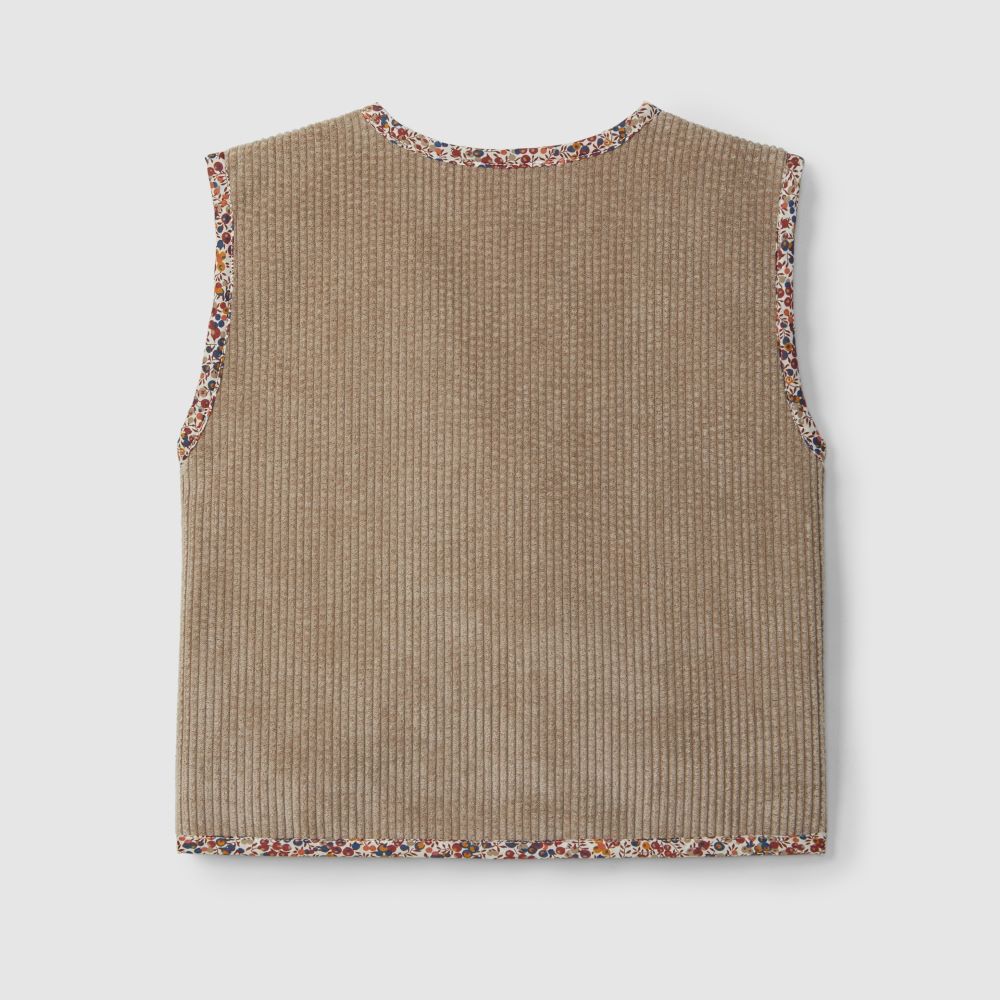 Colete em tecido duplo bombazine e pelo no interior com detalhes em tecido estampado. Aperta com alamar na frente.