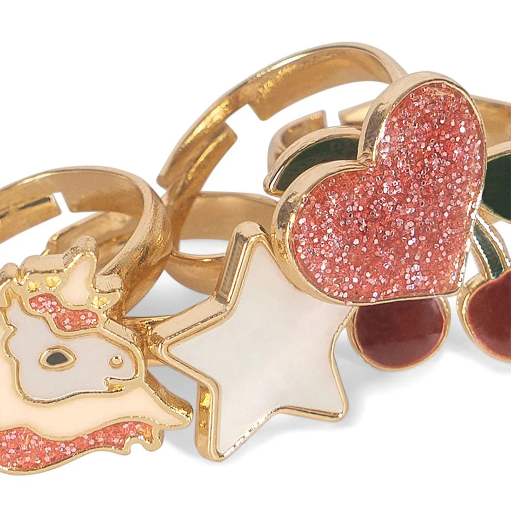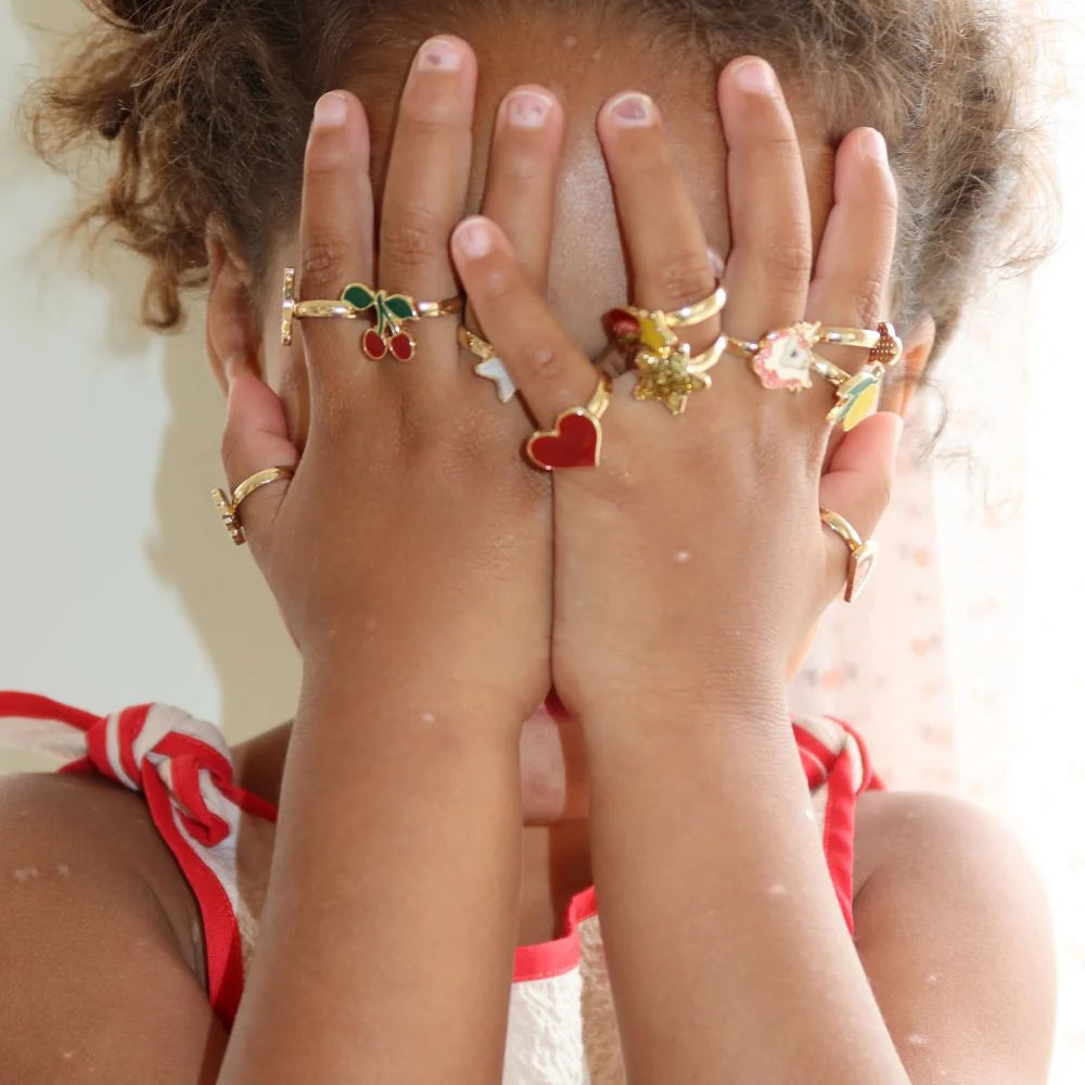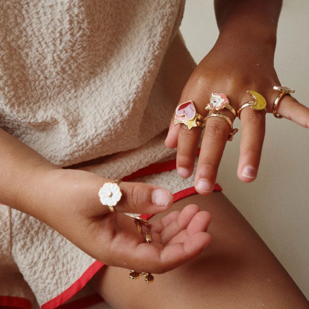 Anéis ajustáveis com motivos decorativos adequados para dedos pequenos.