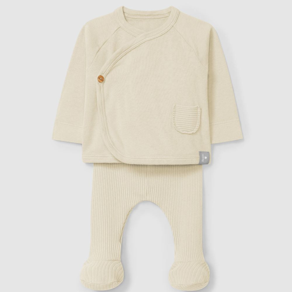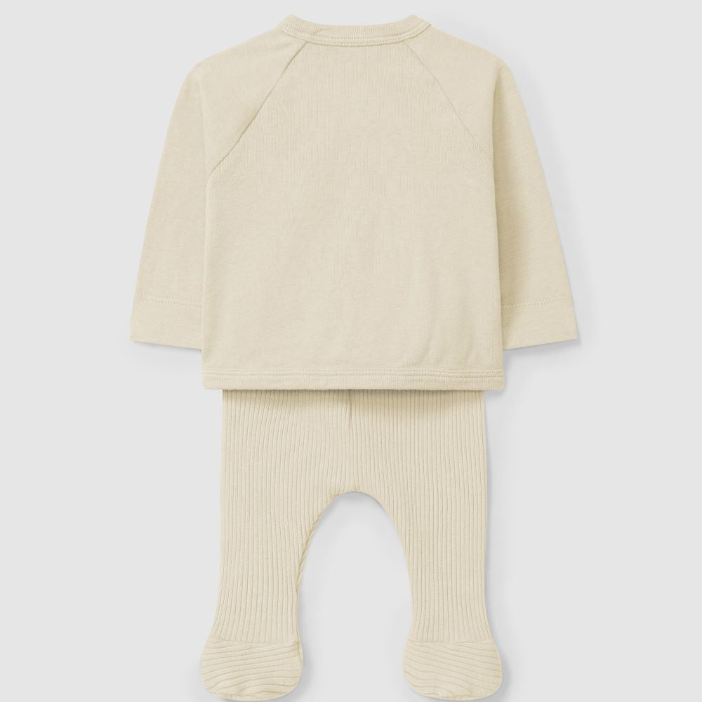 Conjunto de duas peças em malha canelada de algodão orgânico e reciclado. Camisola em malha lisa com bolso funcional. Aperta em trespasse com botão de madeira no exterior e mola no interior. Calças pull-up com pé em malha canelada e botões decorativos na cintura.