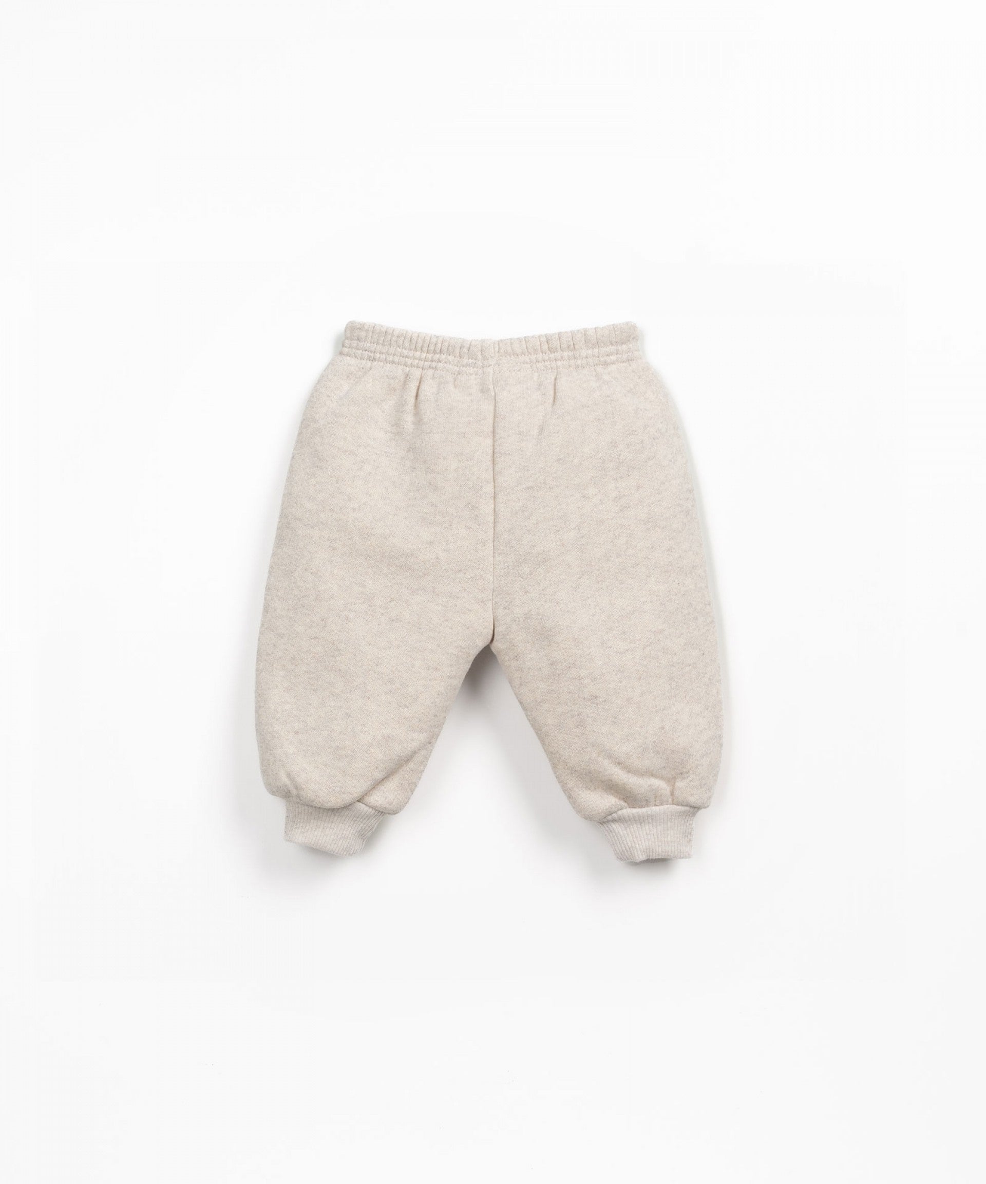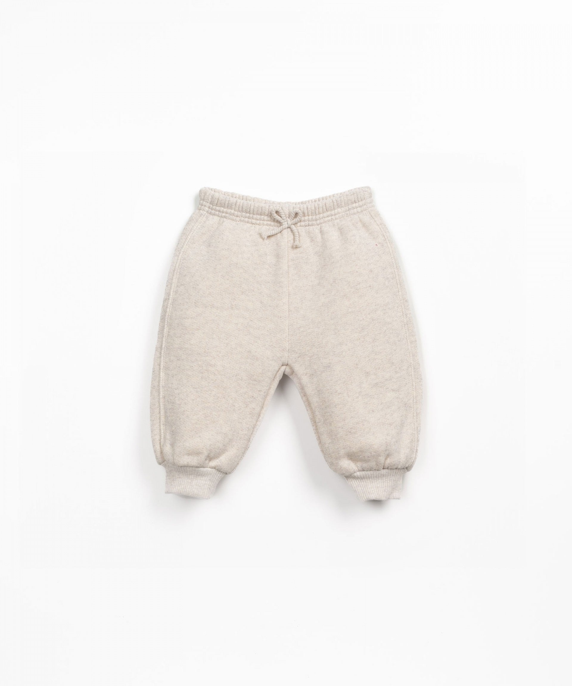 As calças são feitas em malha com mistura de algodão, algodão reciclado e poliéster reciclado, na cor Cru. São um modelo com cintura e punhos elásticos e cordão decorativo.