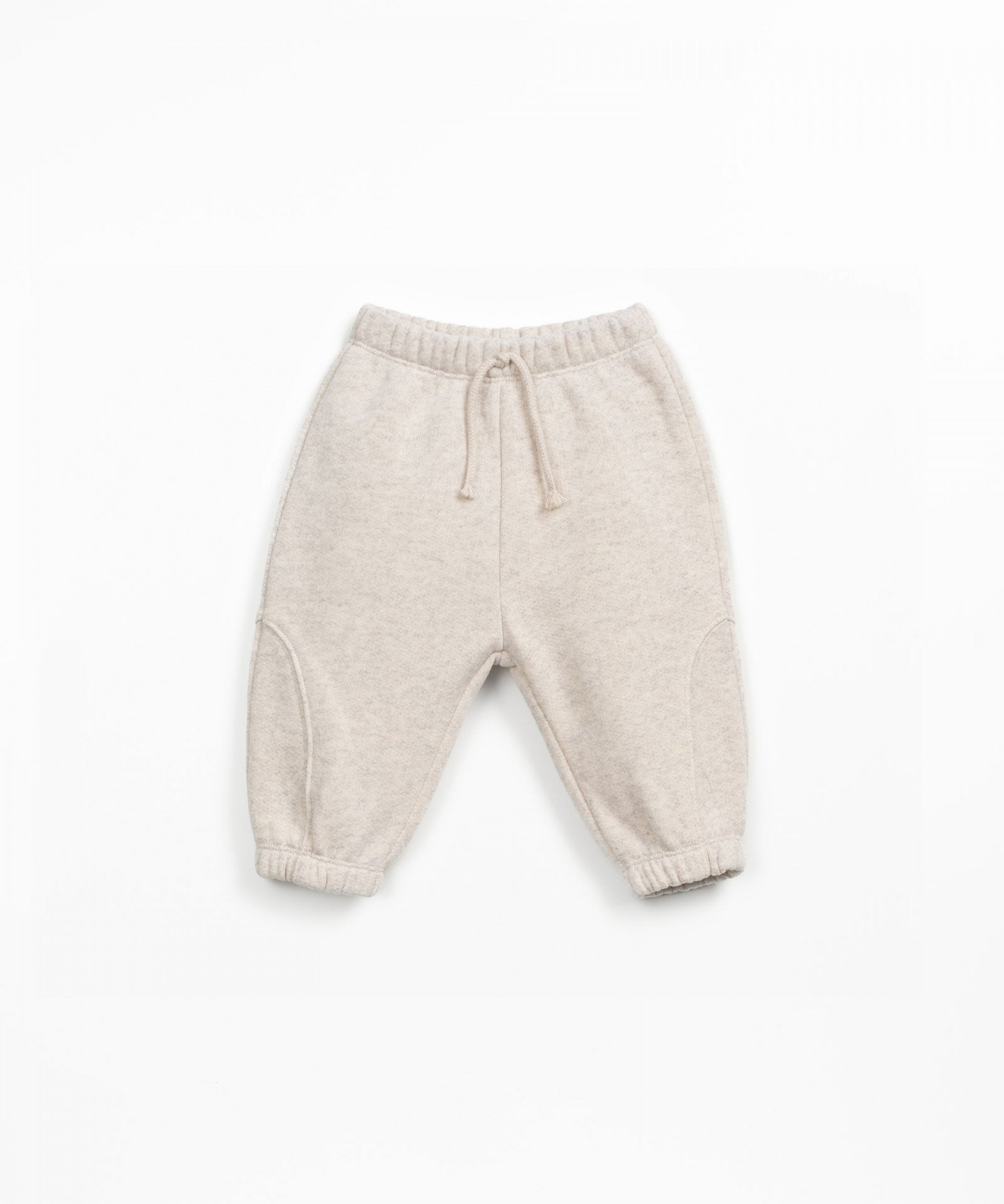 Estas calças felpa são feitas em mistura de algodão, algodão reciclado e poliéster reciclado, na cor Cru. São modelo com elástico nos punhos e no cinto e tem aplicação de cordão decorativo.
