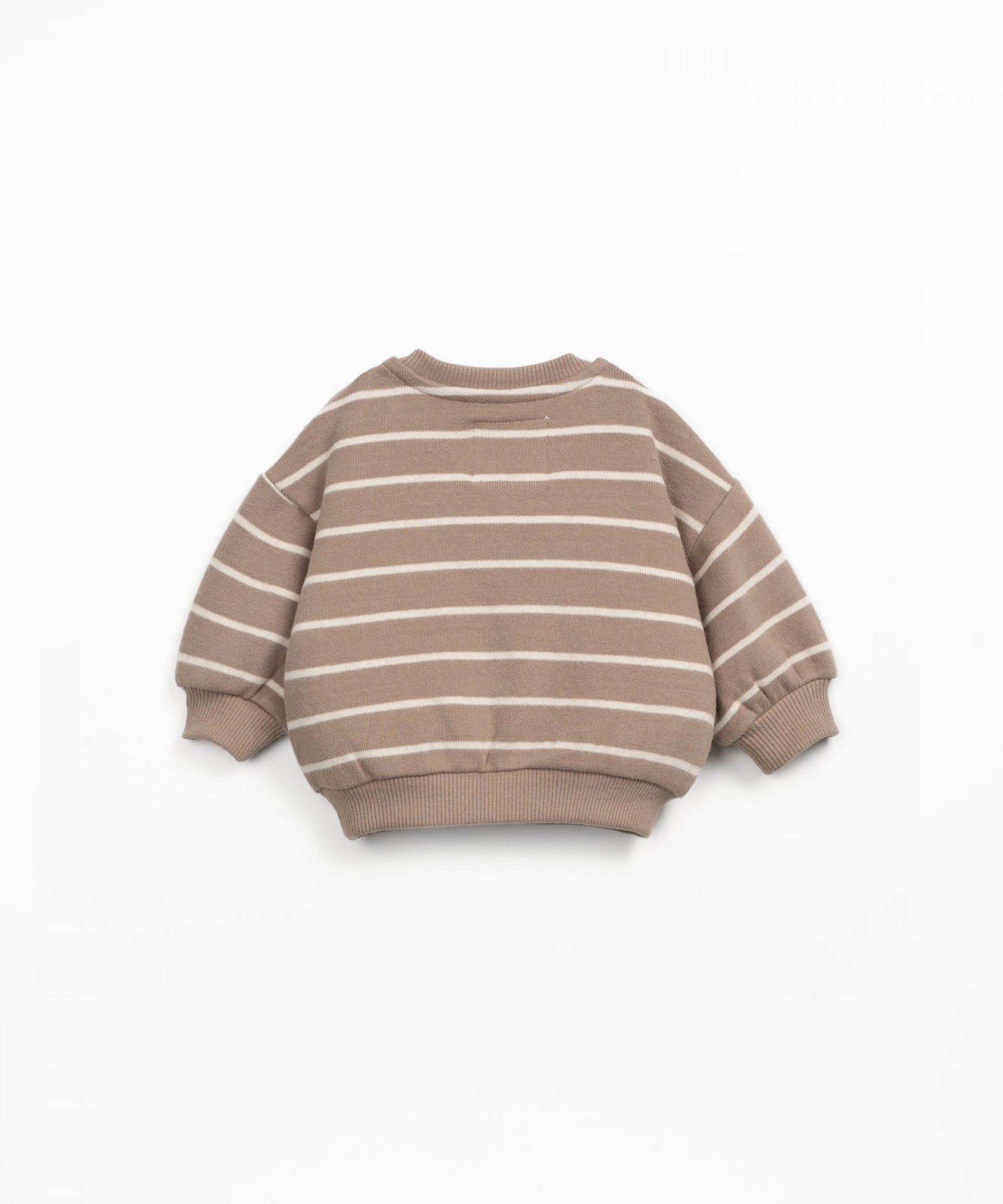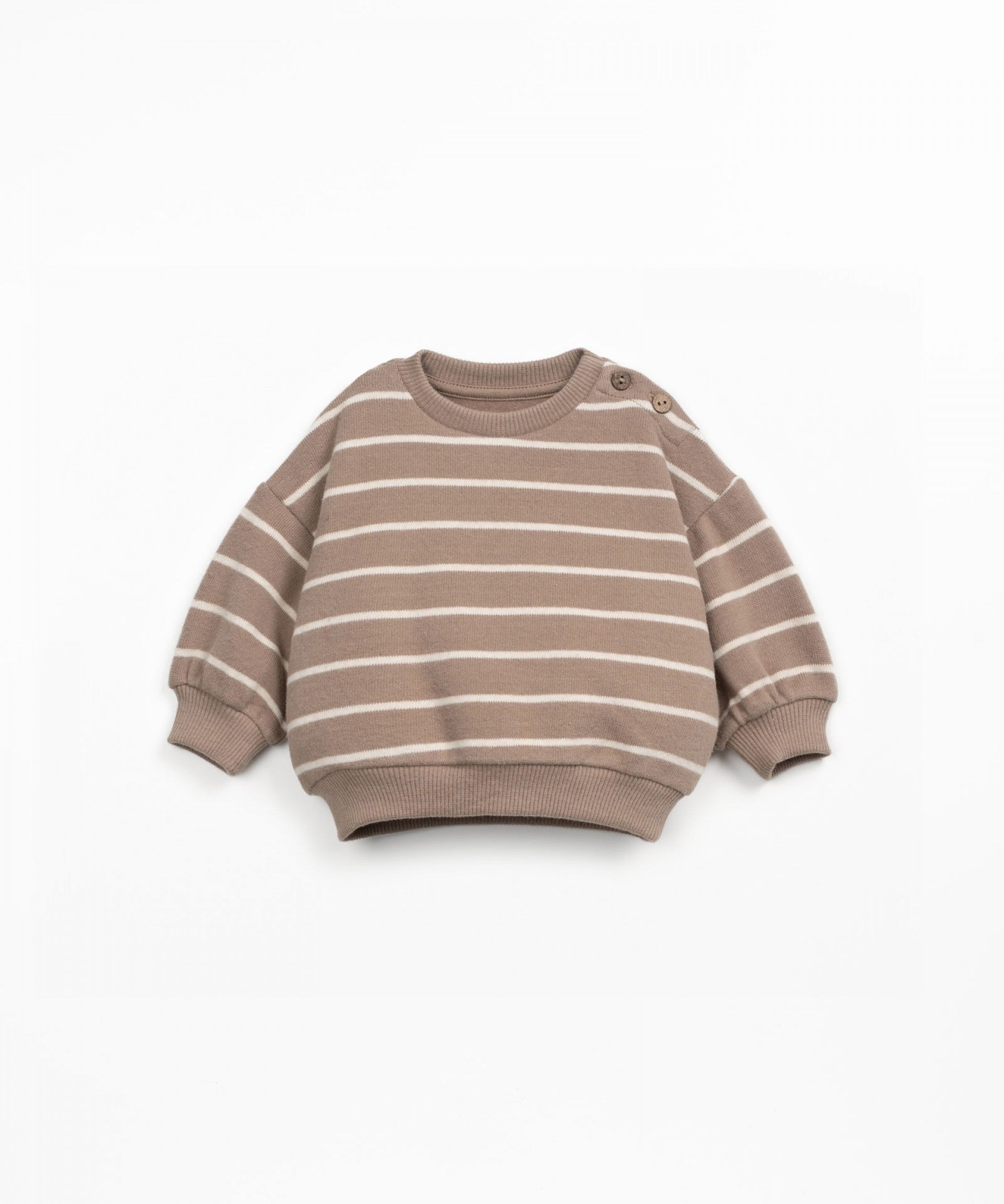 Esta camisola é feita em malha com mistura de algodão regenerativo e algodão reciclado, na cor Meio Branco. É um modelo com manga comprida, decote redondo, tem aplicação de punhos e cinto elásticos, abertura no ombro com botões de coco e padrão de riscas.