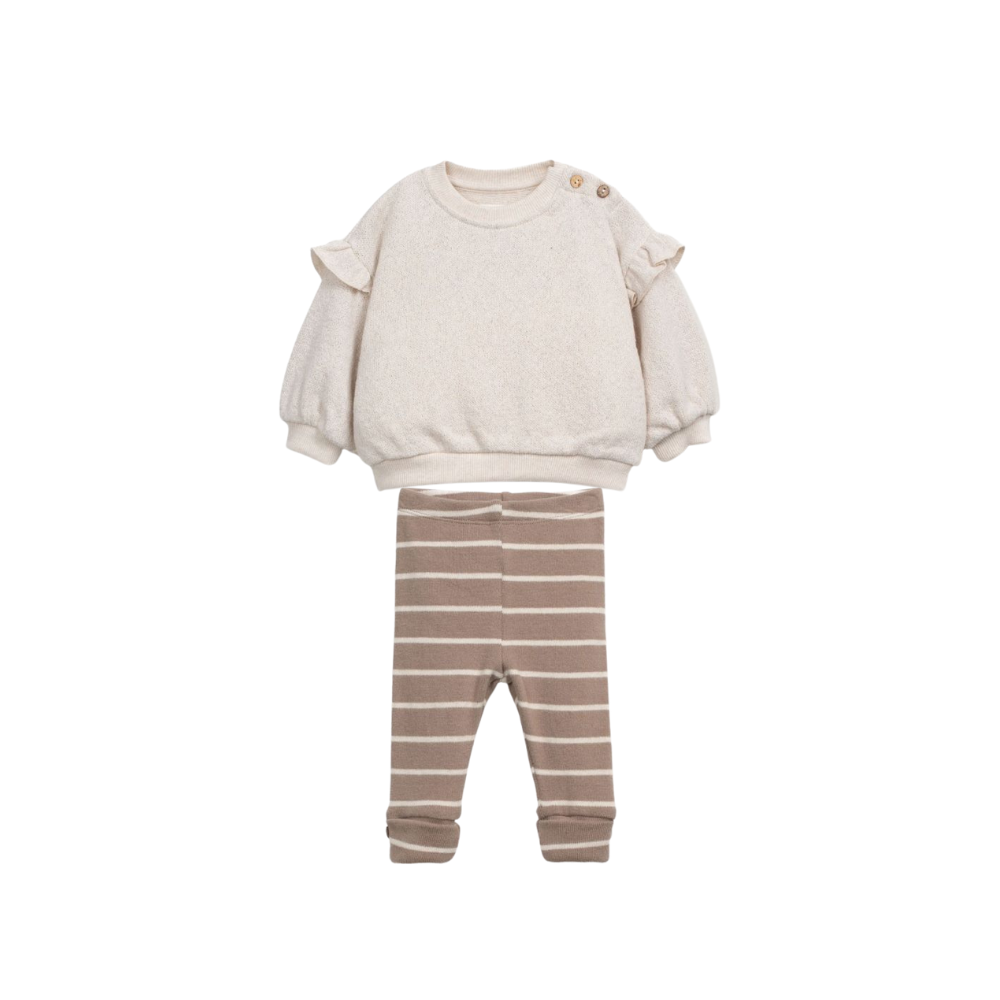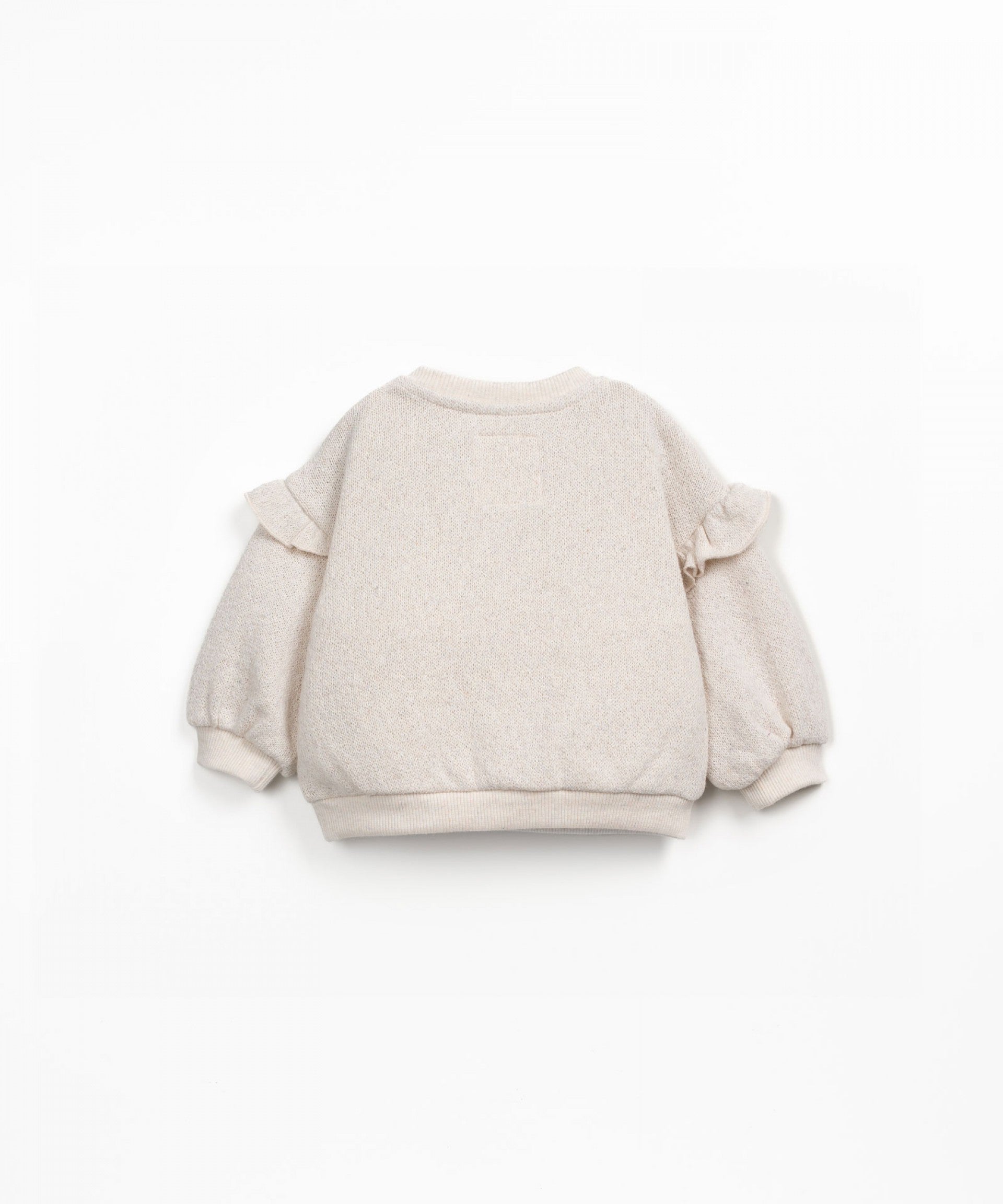 Esta camisola é feita em malha com mistura de algodão regenerativo e algodão reciclado, na cor Meio Branco. É um modelo com decote redondo, tem aplicação de punhos e cinto elásticos, pormenor de folho nas mangas e abertura no ombro com botões de coco.