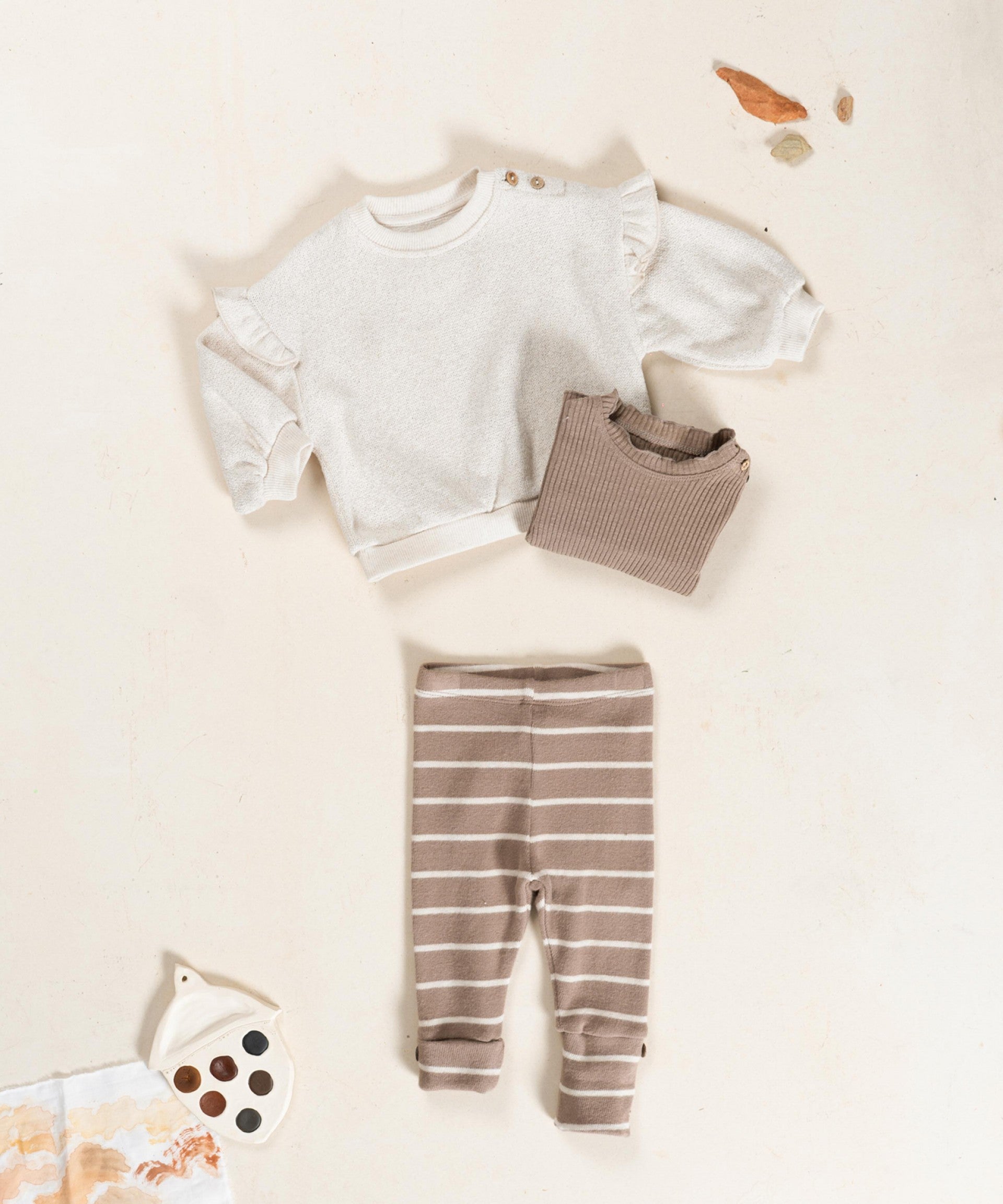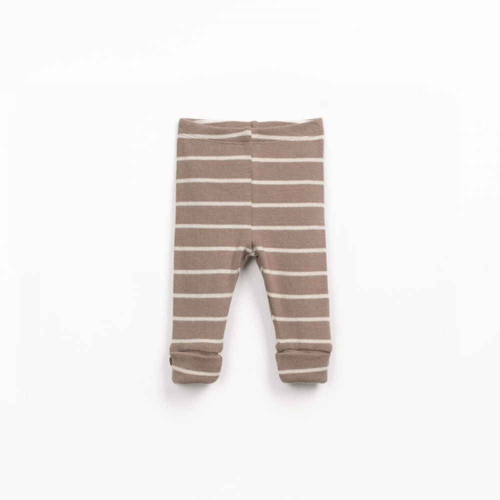 Estas leggings são feitas em malha com mistura de algodão regenerativo e algodão reciclado, na cor Meio Branco. São um modelo com cintura elástica e padrão de riscas.