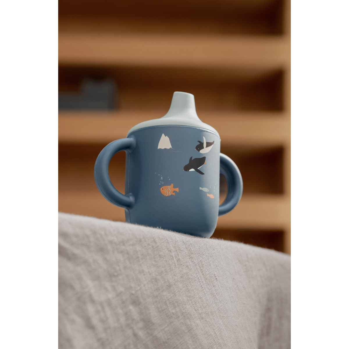 Perfeito para aprender a beber de forma autónoma, o copo de treino Neil tem tampa removível com bico pequeno e textura suave ao toque. As asas laterais permitem uma pega firme, ajudando a praticar o movimento de segurar e inclinar, preparando para o uso de um copo aberto.