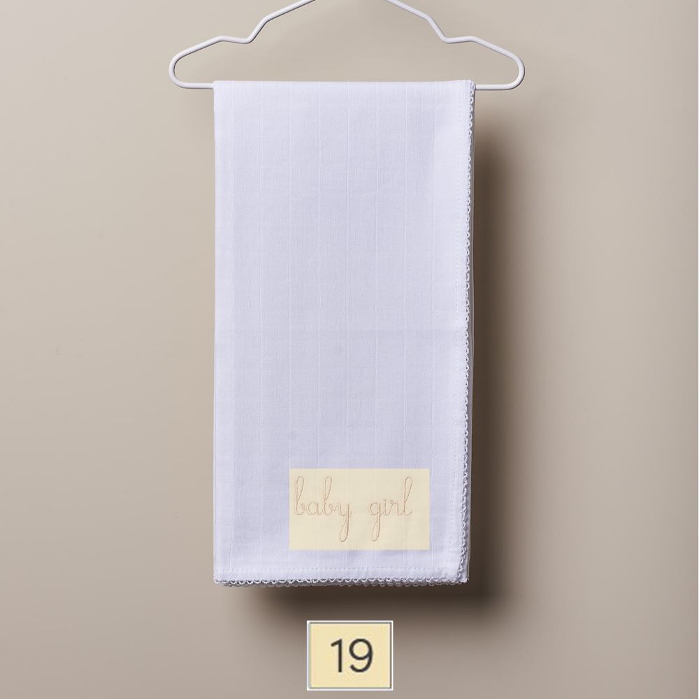 Fralda de pano branca bordada com as palavras "baby girl", produzida em algodão suave, para bebé menina. A fralda de pano BOUNDLESS LOVE com rebordo em branco. O bordado está disponível em várias cores em algodão orgânico (exceto as cores camel, bege escuro e verde seco, que são produzidas em algodão leve).
