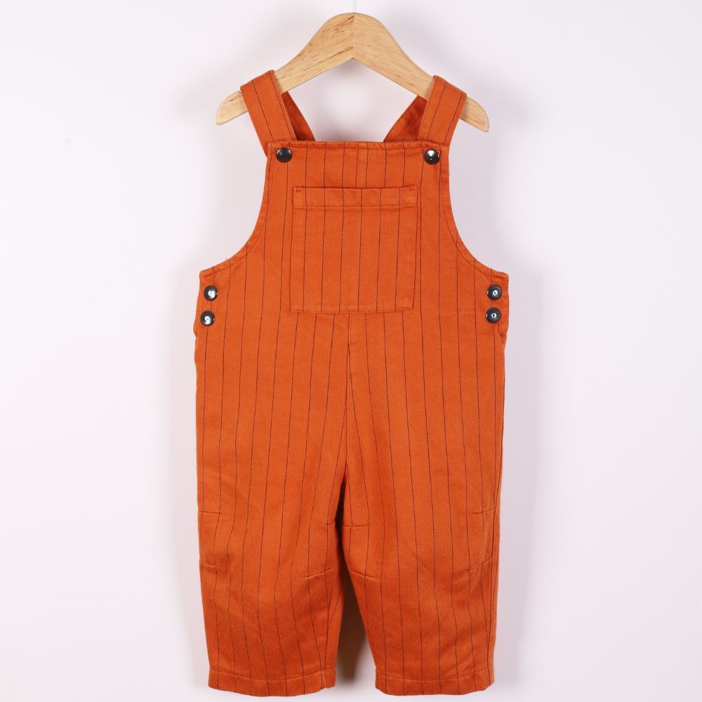 Jardineiras de sarja às riscas WEDOBLE PLAY ideal para meninos e meninas, até aos 6 anos. As jardineiras de alças são produzidas em algodão macio. Tem um bolso à frente e outro atrás e são forradas em algodão leve para maior conforto. Apertam nas alças com molas.