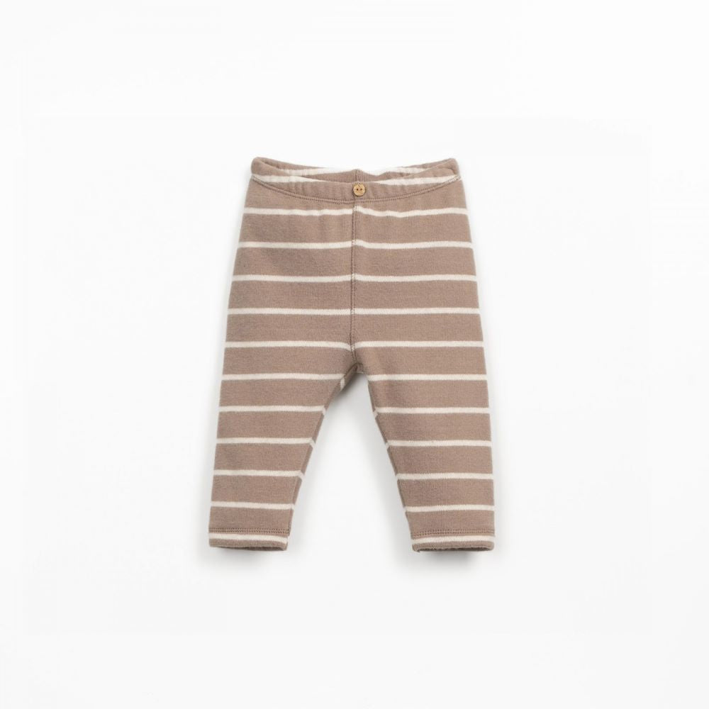 Estas leggings são feitas em malha com mistura de algodão regenerativo e algodão reciclado, na cor Meio Branco. São um modelo com cinto elástico e aplicação de botão de coco decorativo e padrão de riscas.