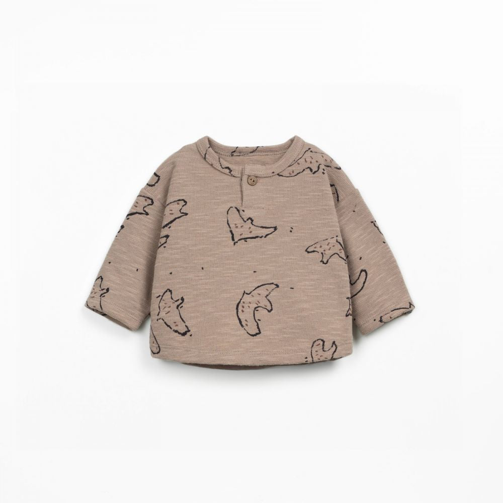 Esta camisola é feita em malha de algodão orgânico, na cor Castanho Claro. É um modelo com manga comprida, decote redondo, botão de coco decorativo no peito e com o nosso estampado de pássaros.