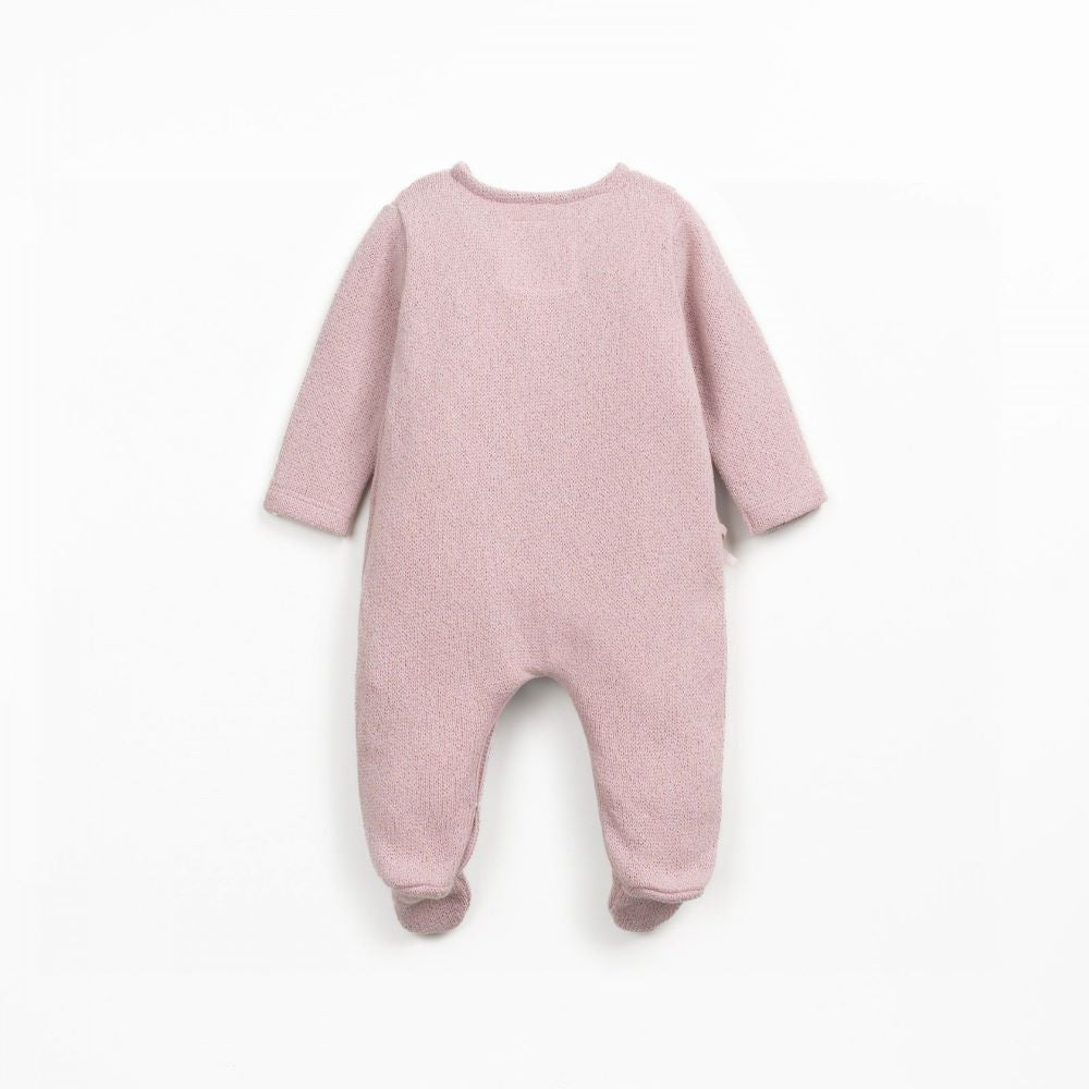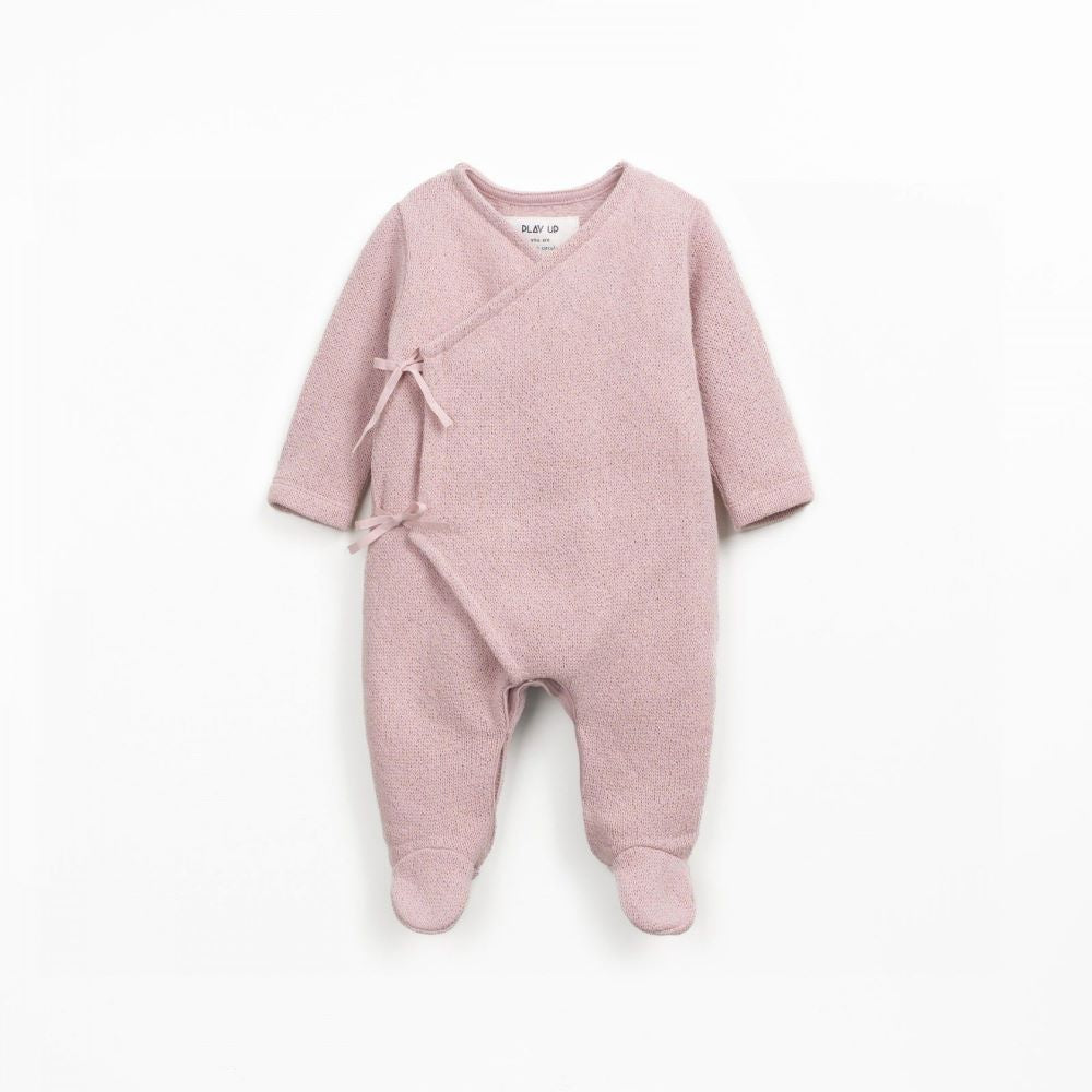 Este macacão é feito em malha com mistura de algodão regenerativo e algodão reciclado, na cor Meio Branco. É um modelo com carda interior, manga comprida e pé contínuo, tem abertura em trespasse com fita no exterior e mola de pressão no interior e abertura entre pernas com molas de metal sem níquel.