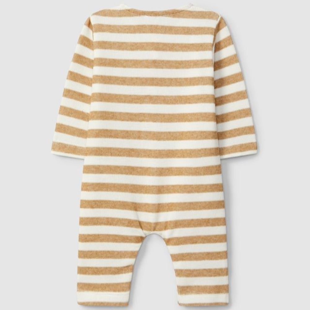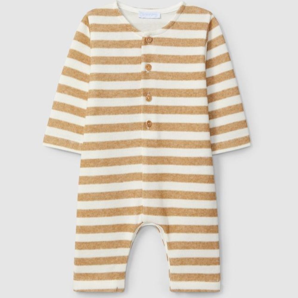 Macacão em malha de riscas com aspecto tricotado 100% algodão. Aperta com botões de madeira Laranjinha na frente e molas no entrepernas.