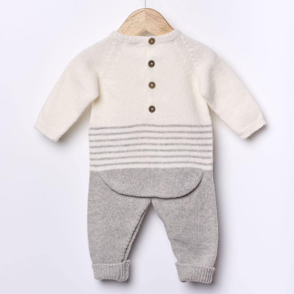 Macacão suavemente tricotado em malha suave de lã merino extrafina, ideal para bebés meninos e meninas. O macacão SNOWFLAKE aperta nas costas com botões de côco e entre as pernas com molas.