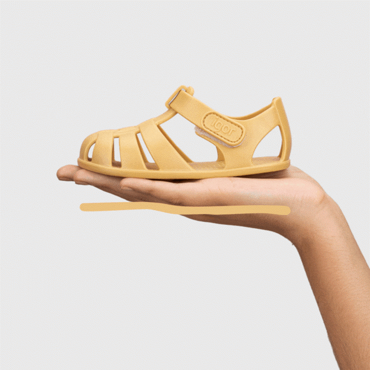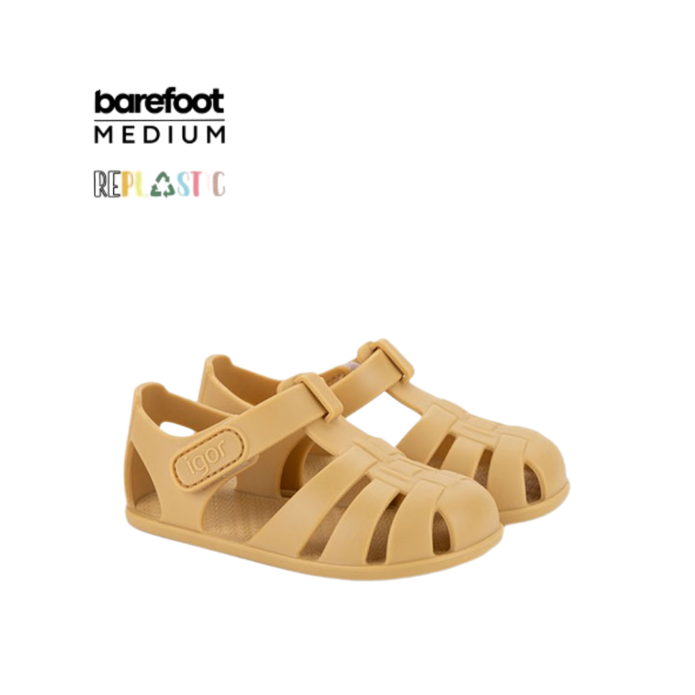 Sandálias clássicas com conceito descalço, queda zero, flexível e macio, feito com pelo menos 50% de PVC reciclado livre de ftalatos e fecho aderente.
