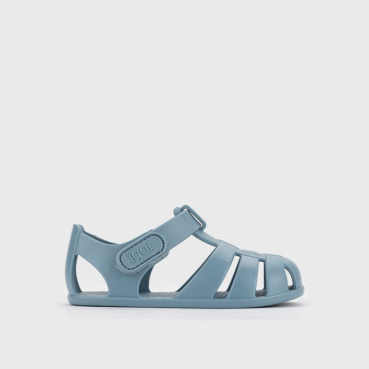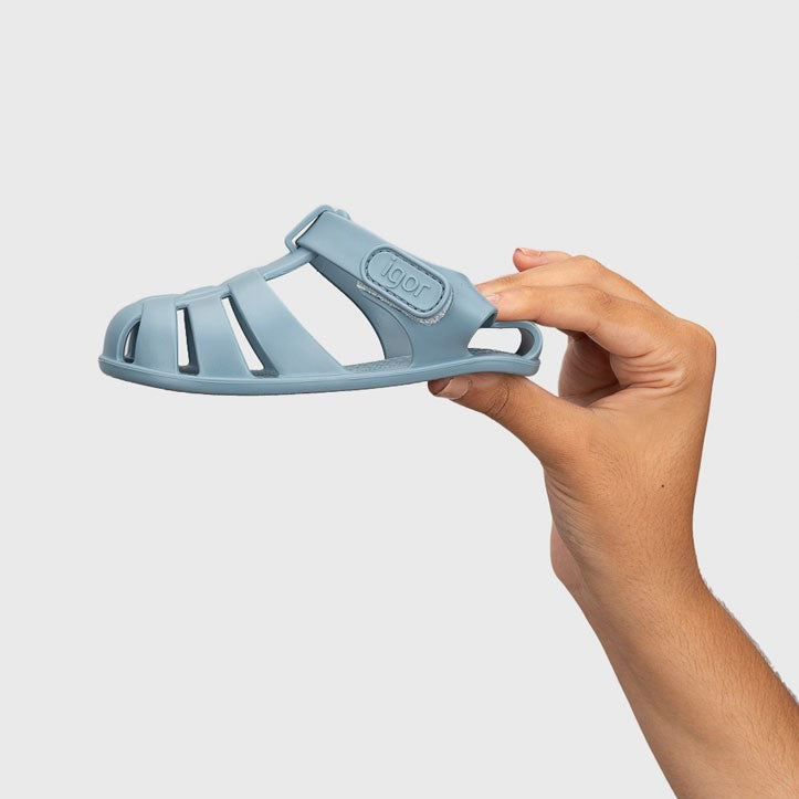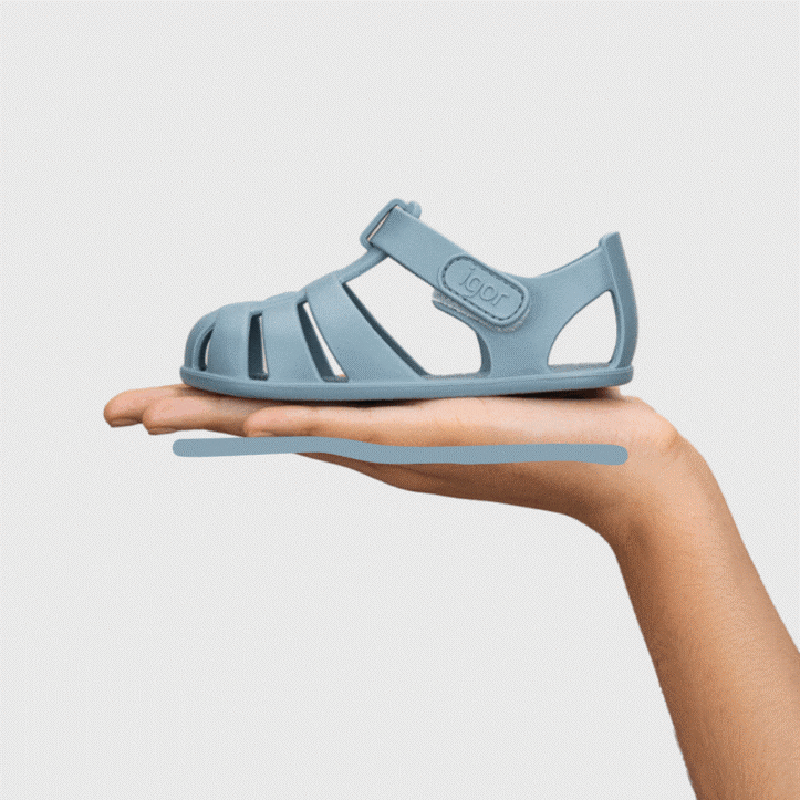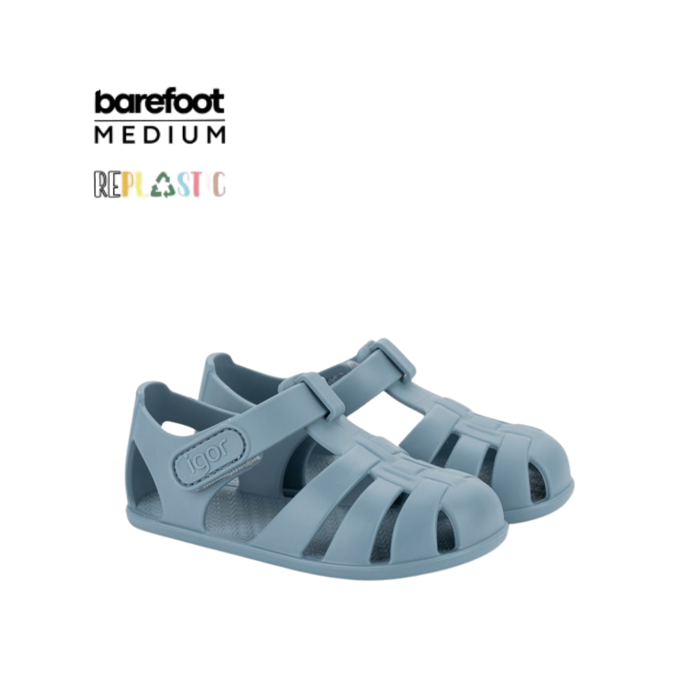 Sandálias clássicas com conceito descalço, queda zero, flexível e macio, feito com pelo menos 50% de PVC reciclado livre de ftalatos e fecho aderente.