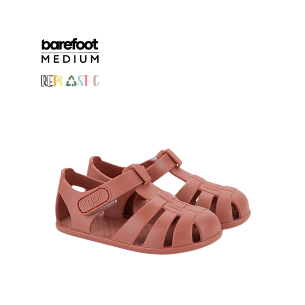 Sandálias clássicas com conceito descalço, queda zero, flexível e macio, feito com pelo menos 50% de PVC reciclado livre de ftalatos e fecho aderente.