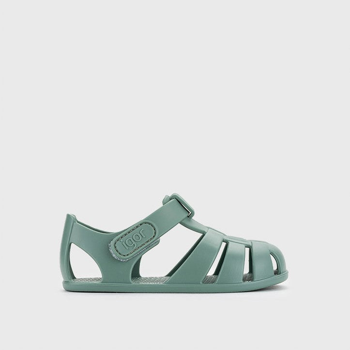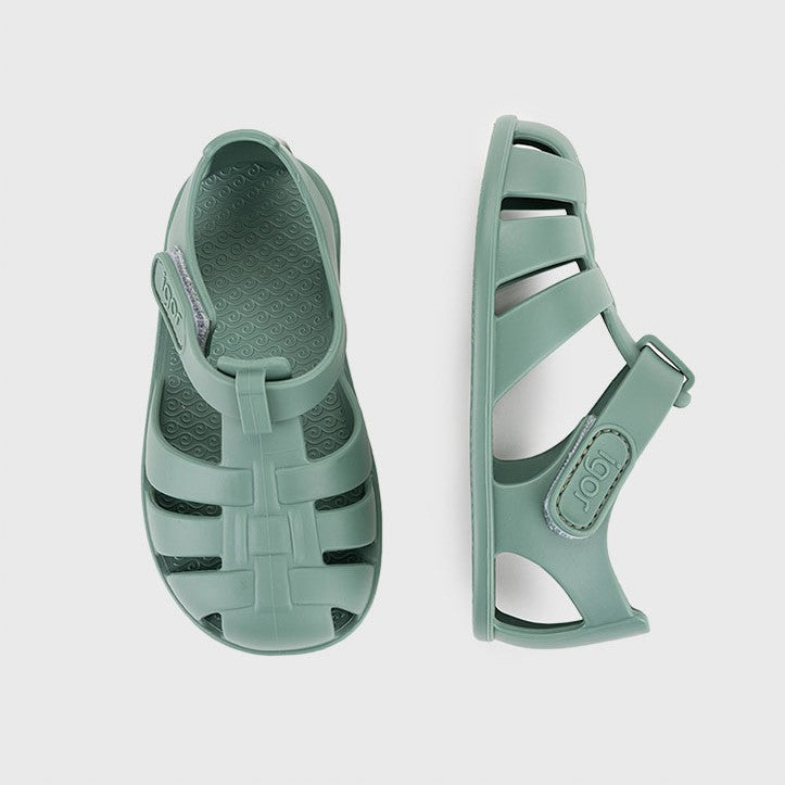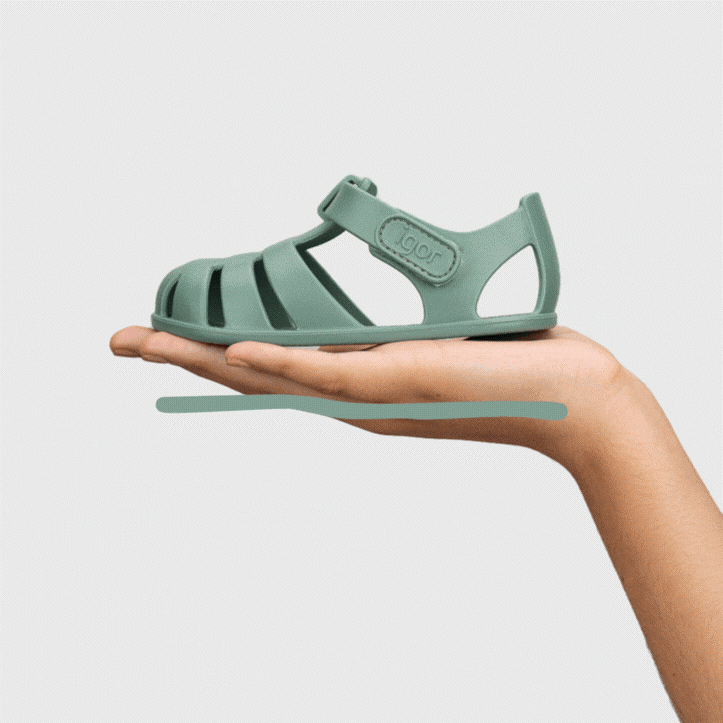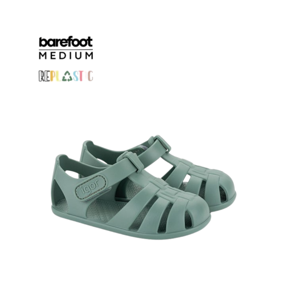 Sandálias clássicas com conceito descalço, queda zero, flexível e macio, feito com pelo menos 50% de PVC reciclado livre de ftalatos e fecho aderente.