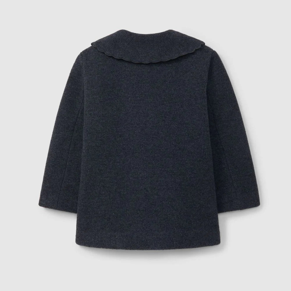 Sobretudo em fazenda com lã. Gola comd etalhe boleado e bolsos funcionais na frente. Todo forrado a pelo exceto nos braços para facilitar o vestir. Aperta com botão e molas escondidas na frente.