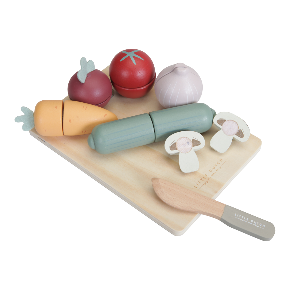 Os vegetais incluídos são: cenoura, cogumelo, pepino, tomate, cebola e beterraba. Todos podem ser divididos em duas peças e montados novamente com velcro.